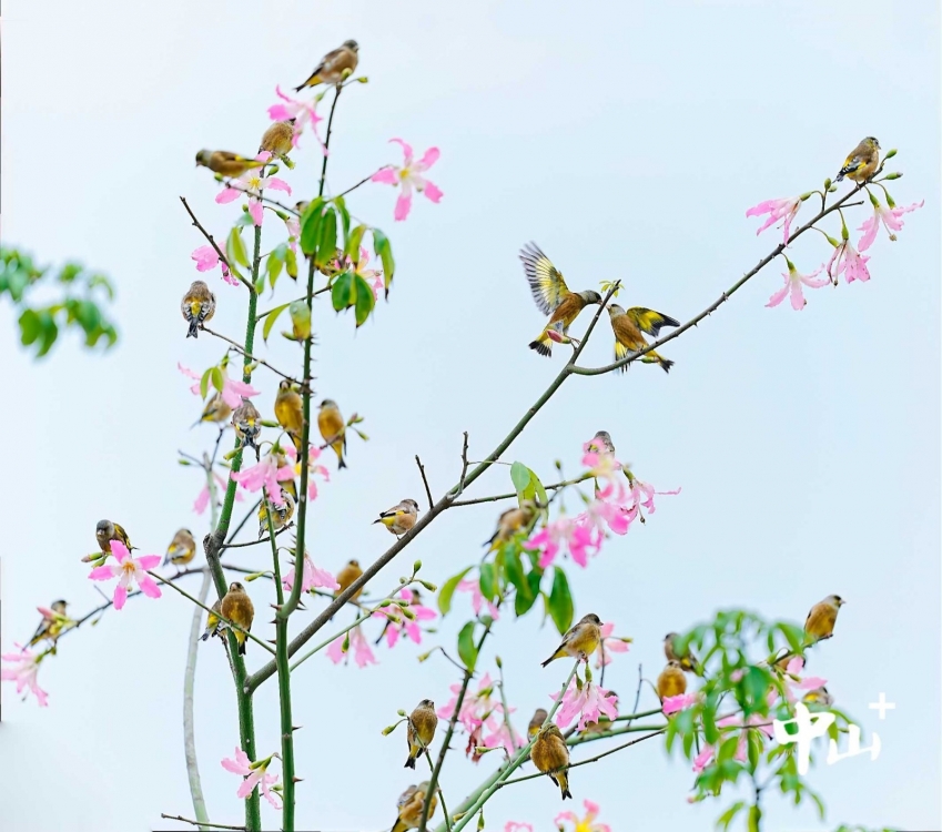 Perching: November 23, many goldfinches are perching on a kapok tree in Tanggan Village, Sanxiang Town. (By Gu Yanfang)