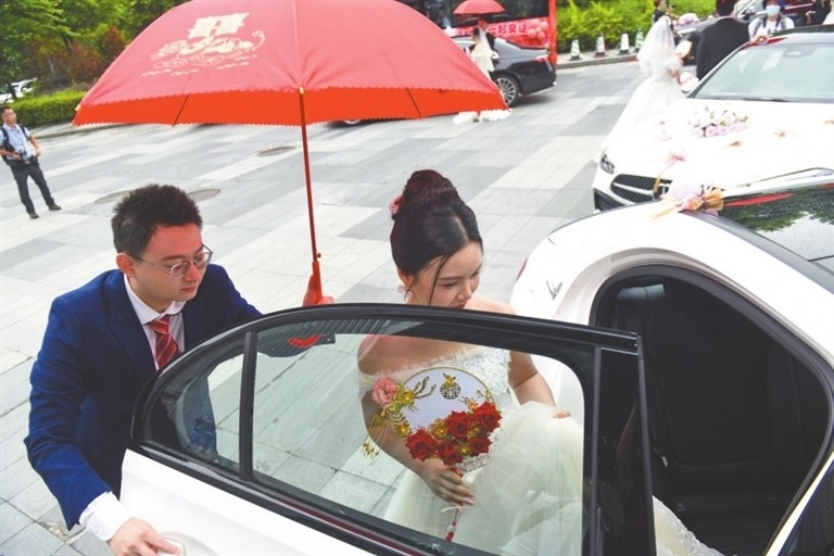 The special wedding cars and the Happy Wedding Bus depart from Zhongshan Talent Park. (Photo by Yu Zhaoyu)