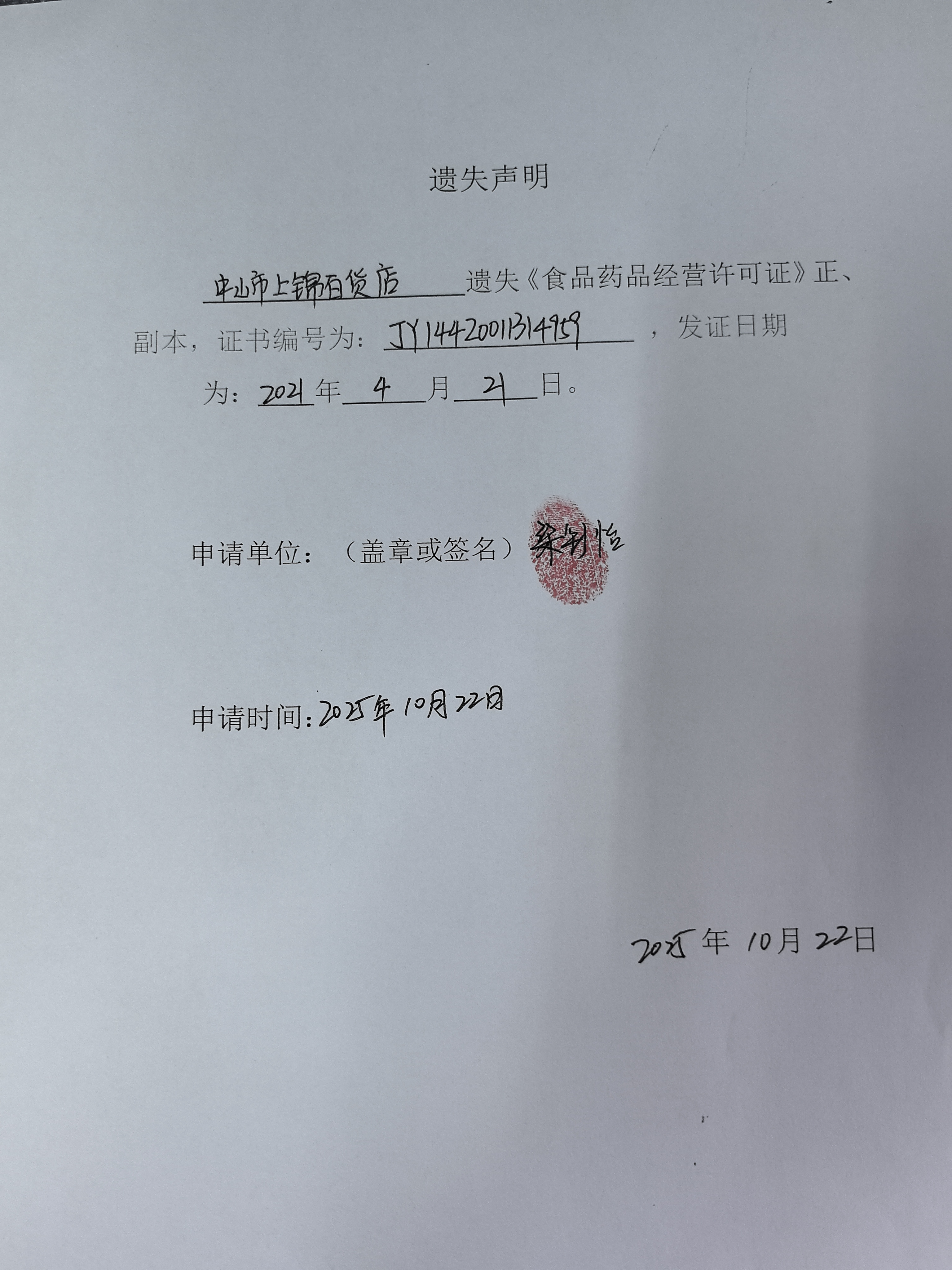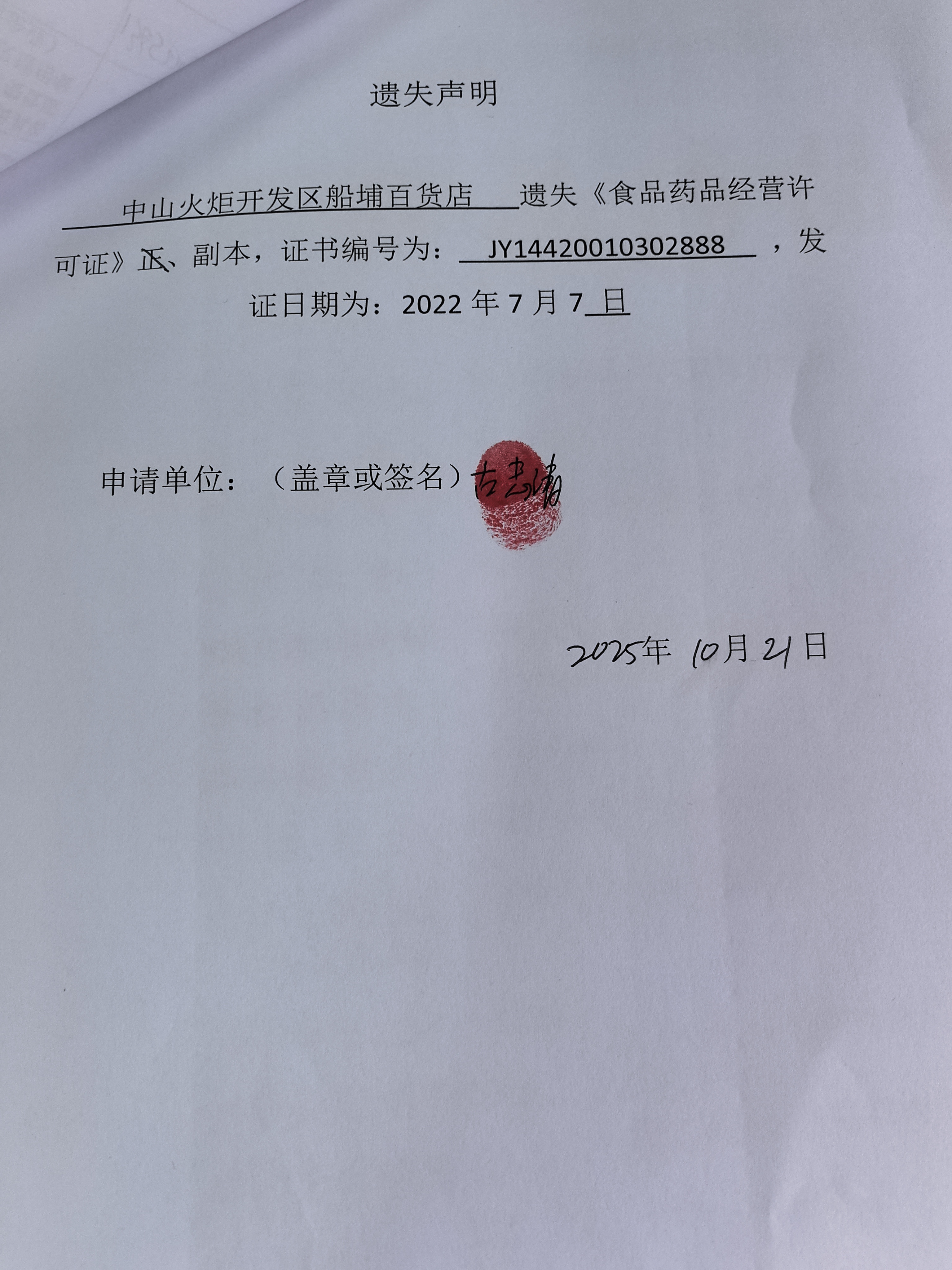 食品药品经营许可证遗失声明(中山火炬开发区船埔百货店,中山市火炬开发区楚贝百货商行,中山市火炬开发区鑫嘉汉堡店,中山市上锦百货店)
