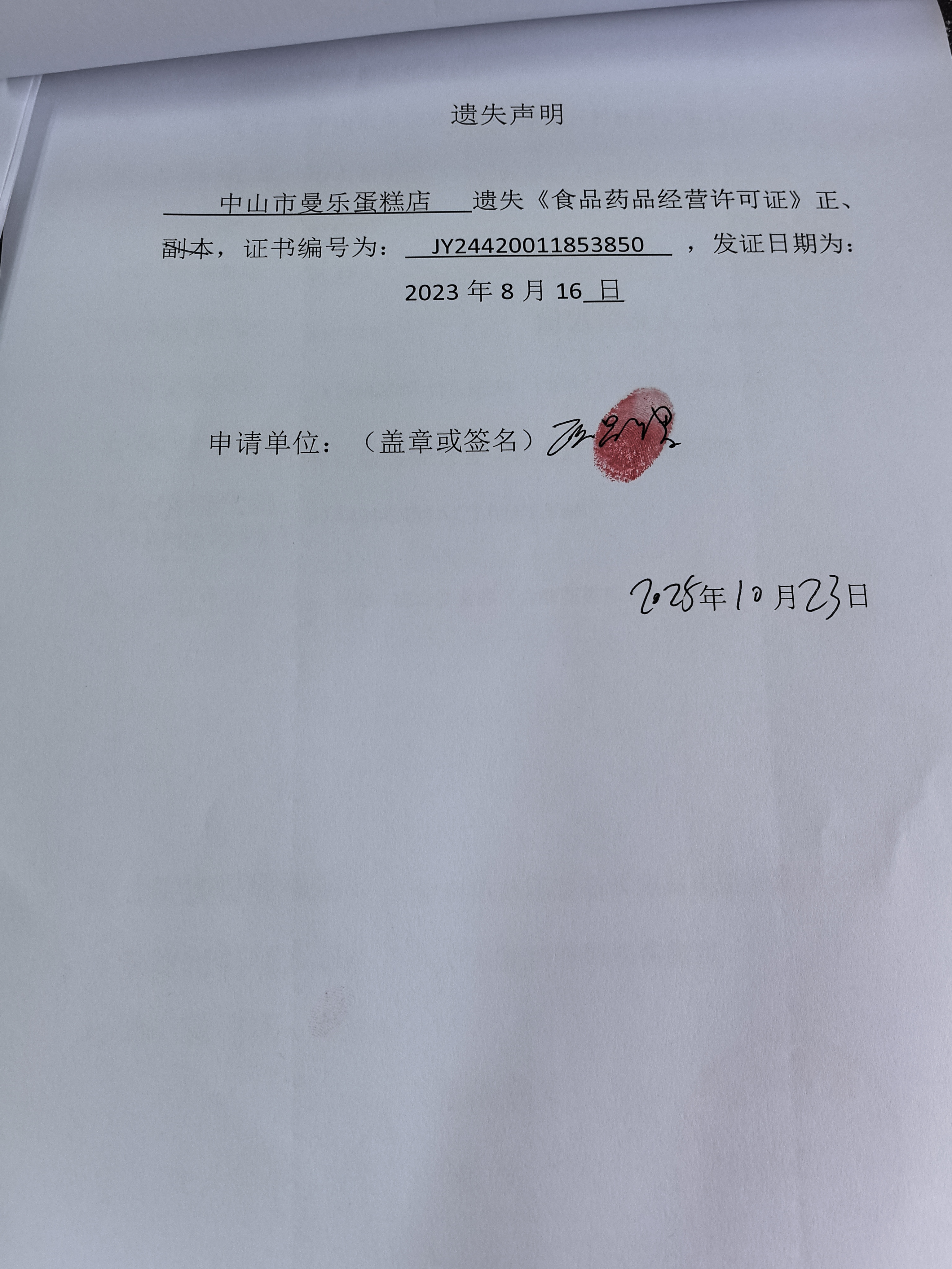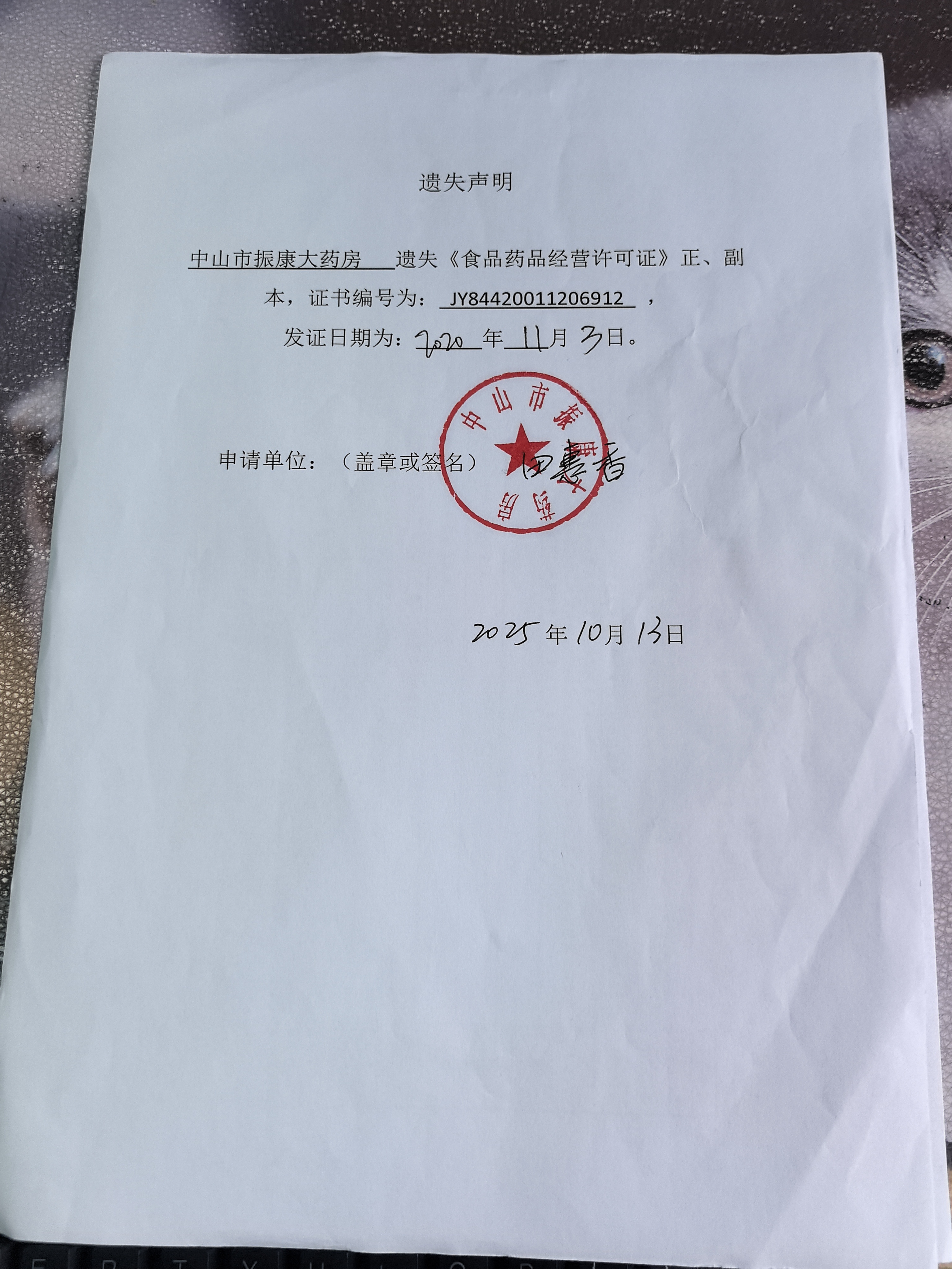 食品药品经营许可证遗失声明(中山市曼乐蛋糕店、中山市振康大药房)