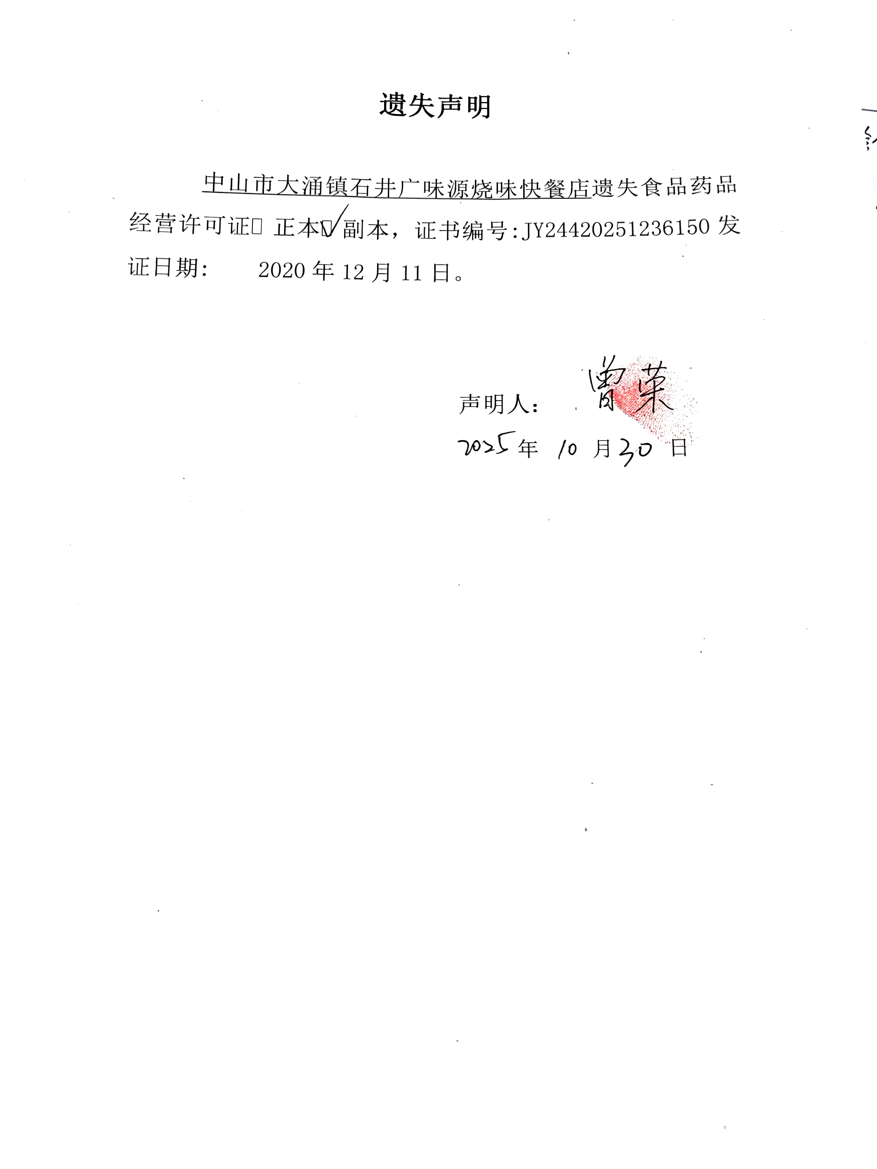 食品药品经营许可证遗失声明(中山市大涌镇石井广味源烧味快餐店)