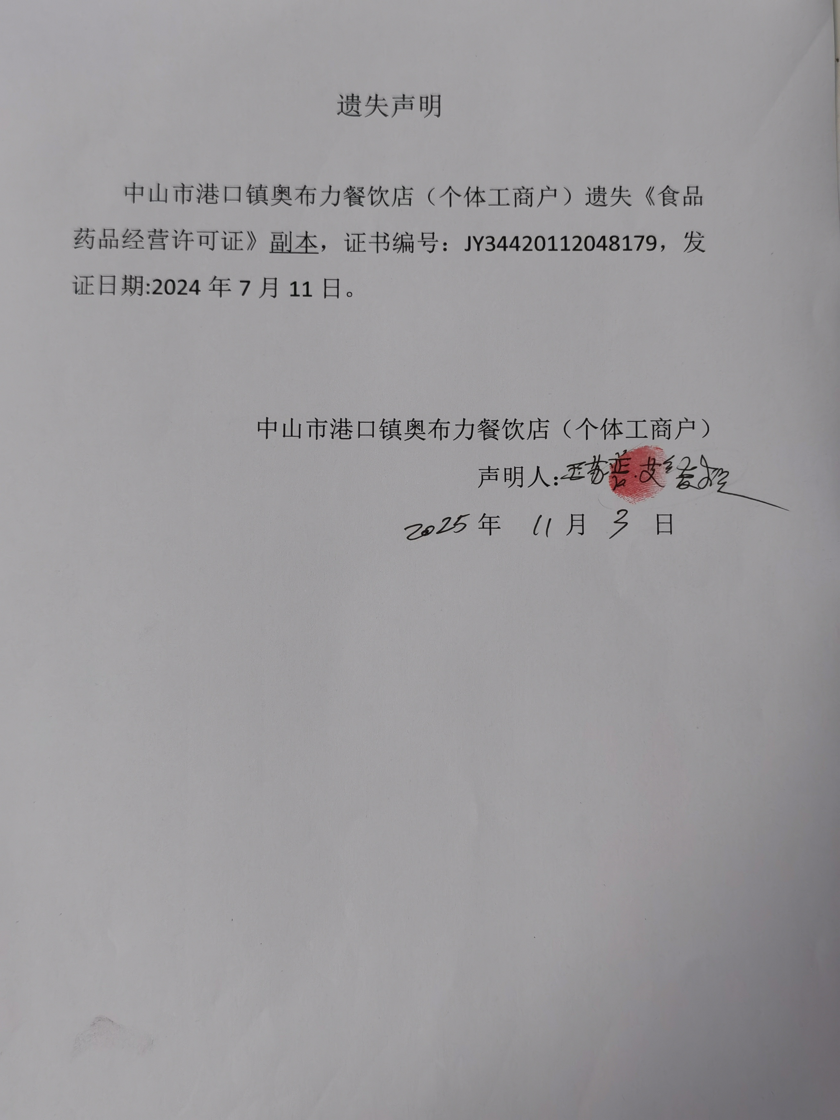 食品药品经营许可证遗失声明〔中山市港口镇奥布力餐饮店(个体工商户)〕.jpg