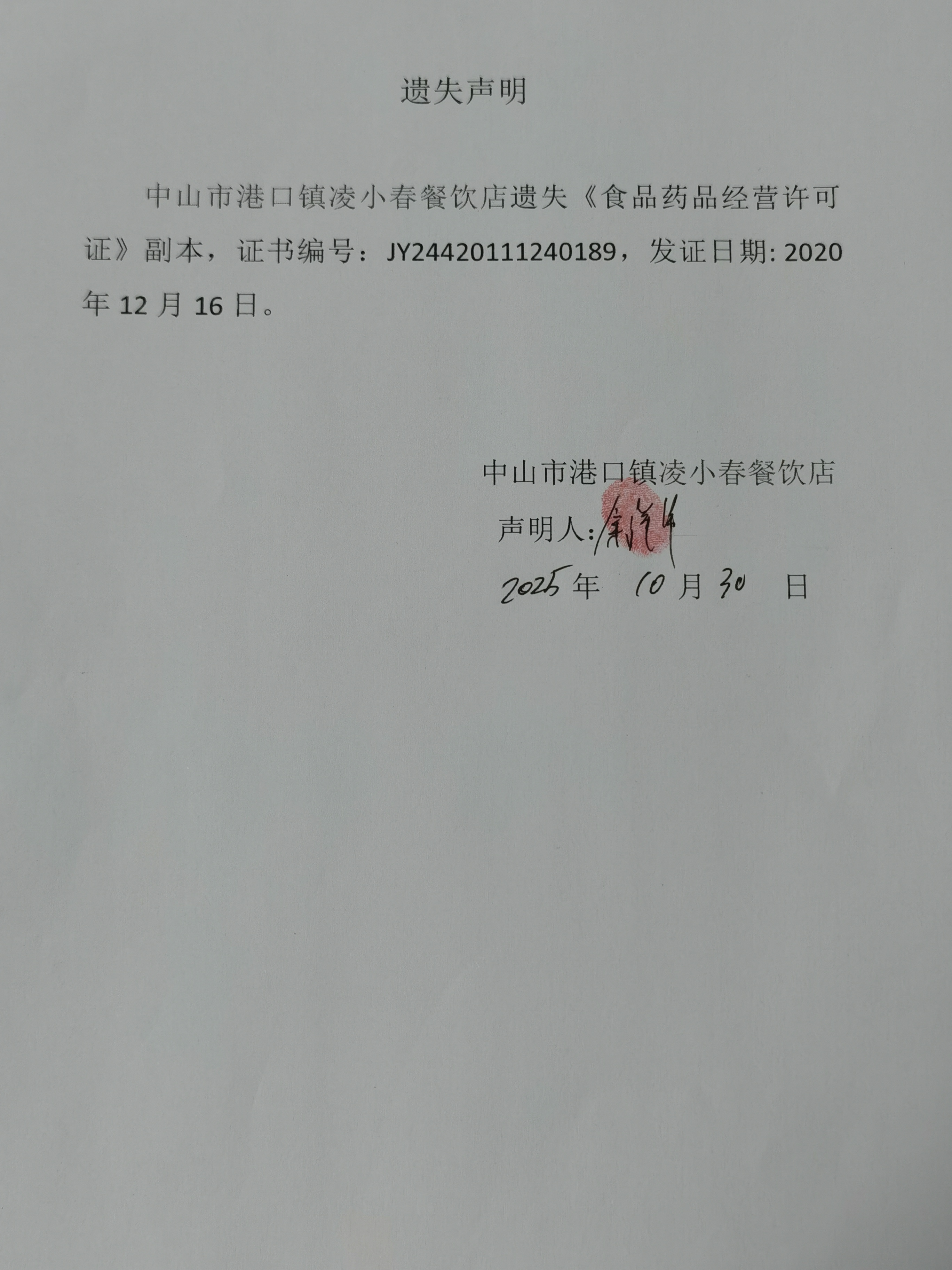 食品药品经营许可证遗失声明(中山市港口镇凌小春餐饮店).jpg