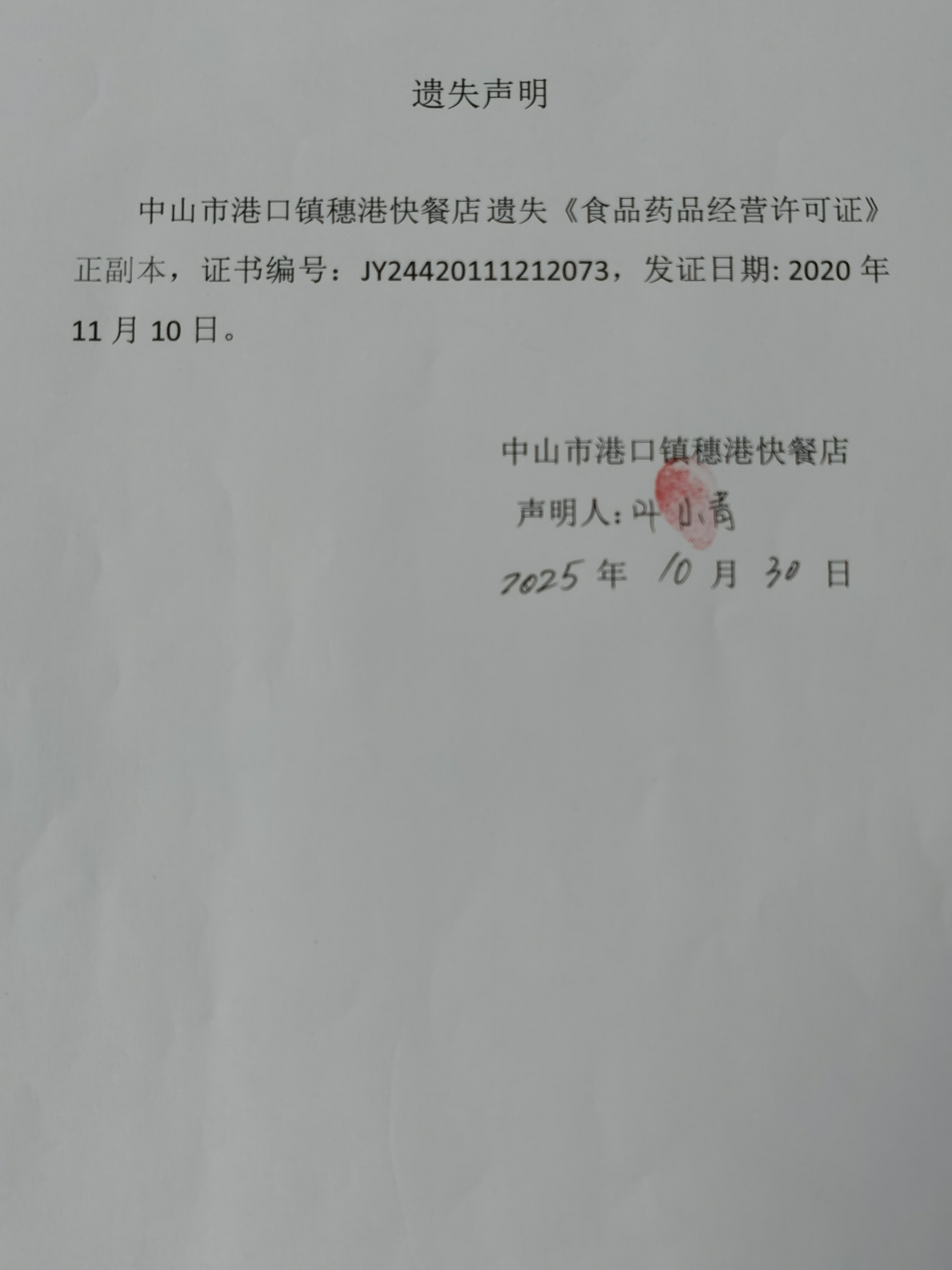 食品药品经营许可证遗失声明(中山市港口镇穗港快餐店).jpg