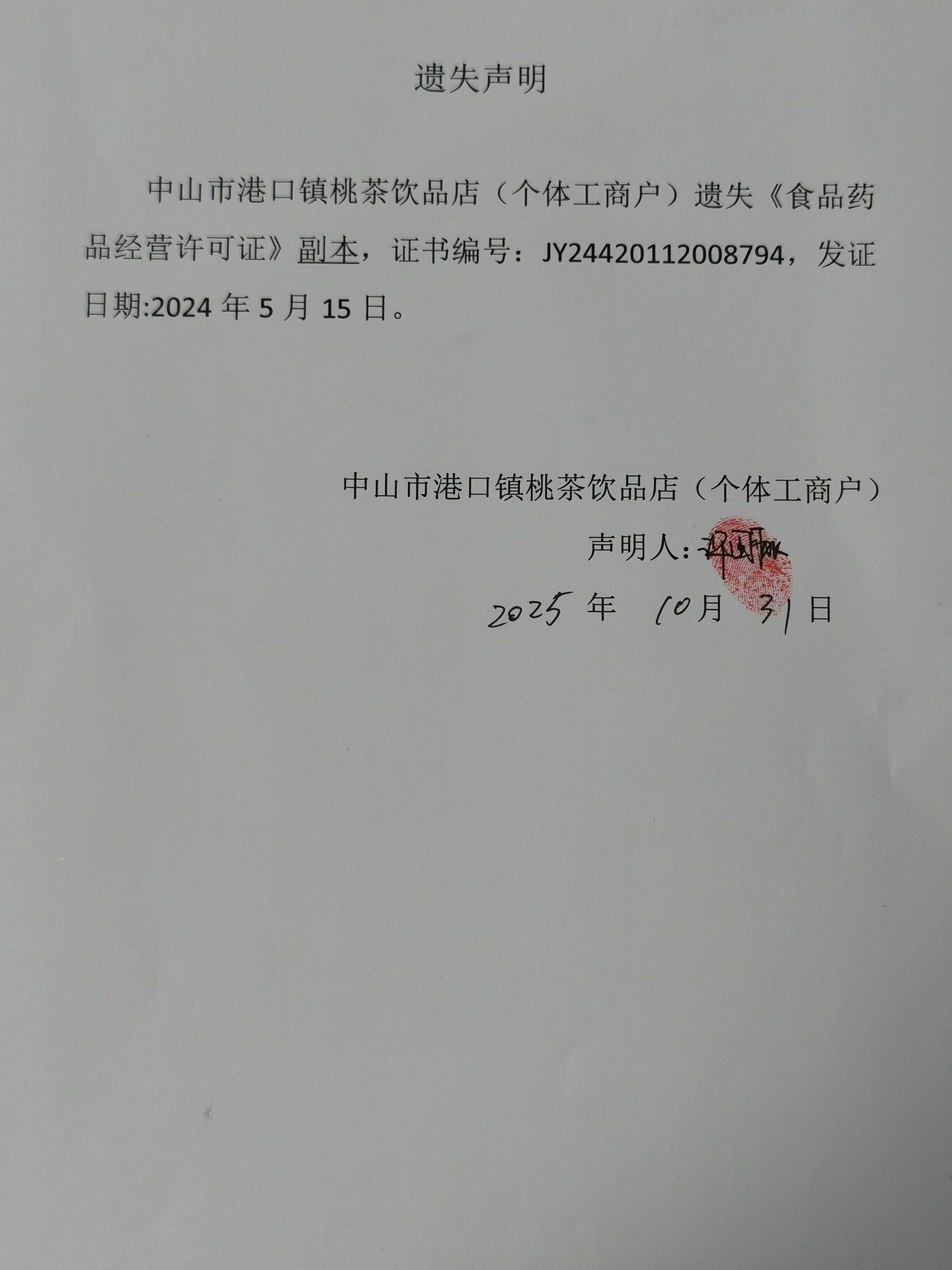 食品药品经营许可证遗失声明〔中山市港口镇桃茶饮品店(个体工商户)〕.jpg