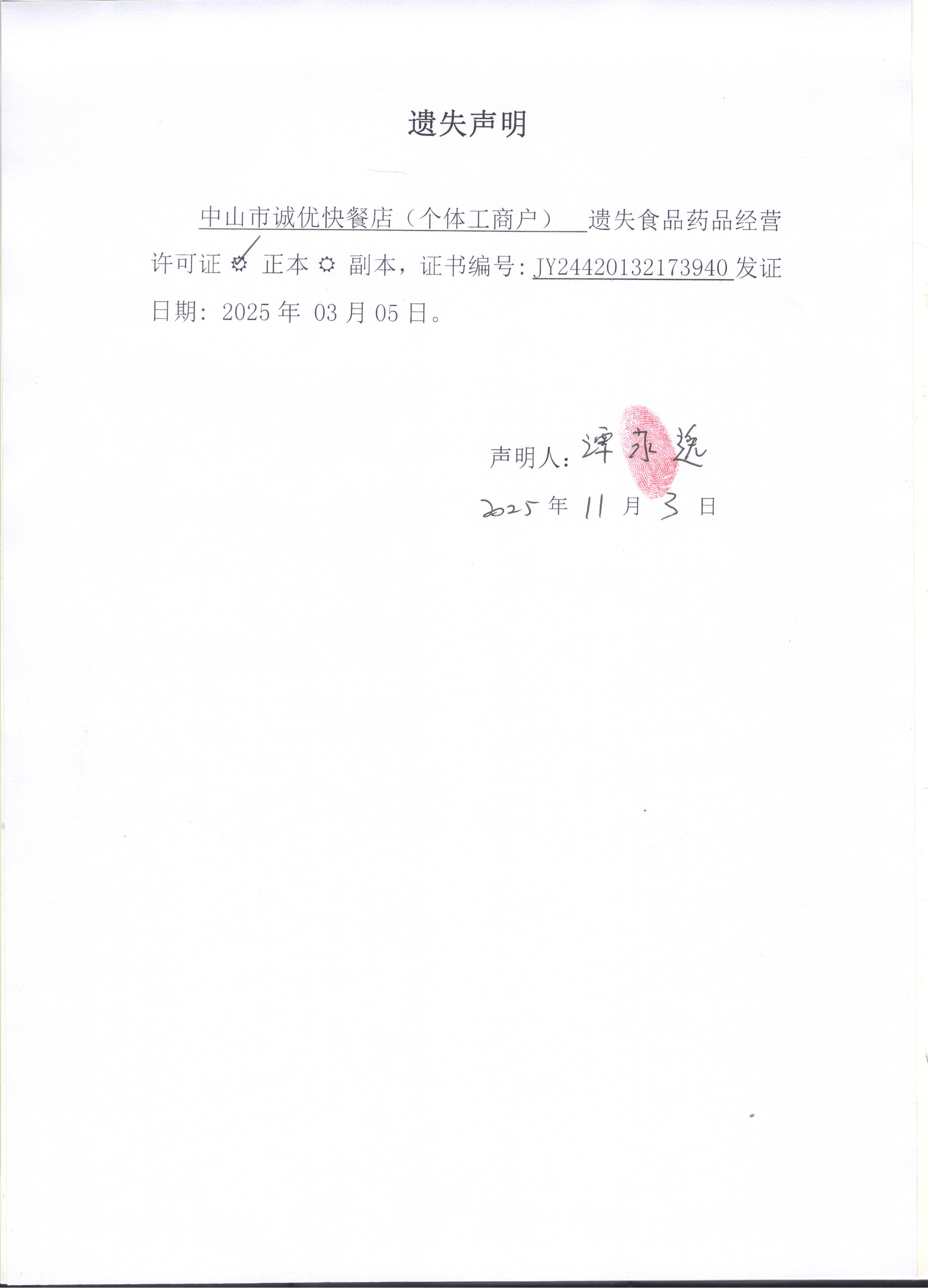食品药品经营许可证遗失声明〔中山市诚优快餐店(个体工商户)〕