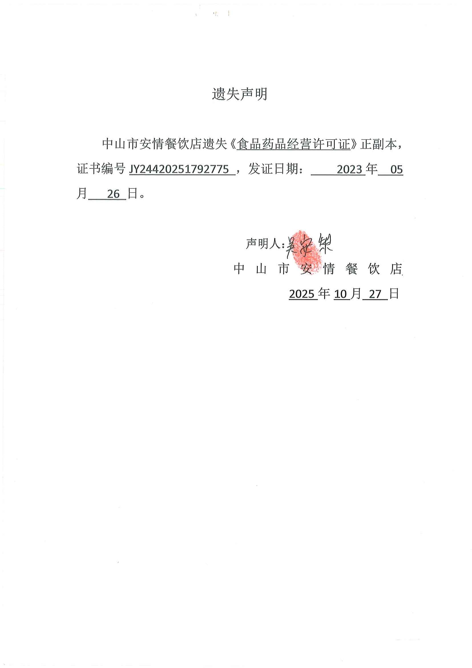 食品药品经营许可证遗失声明(中山市安情餐饮店)