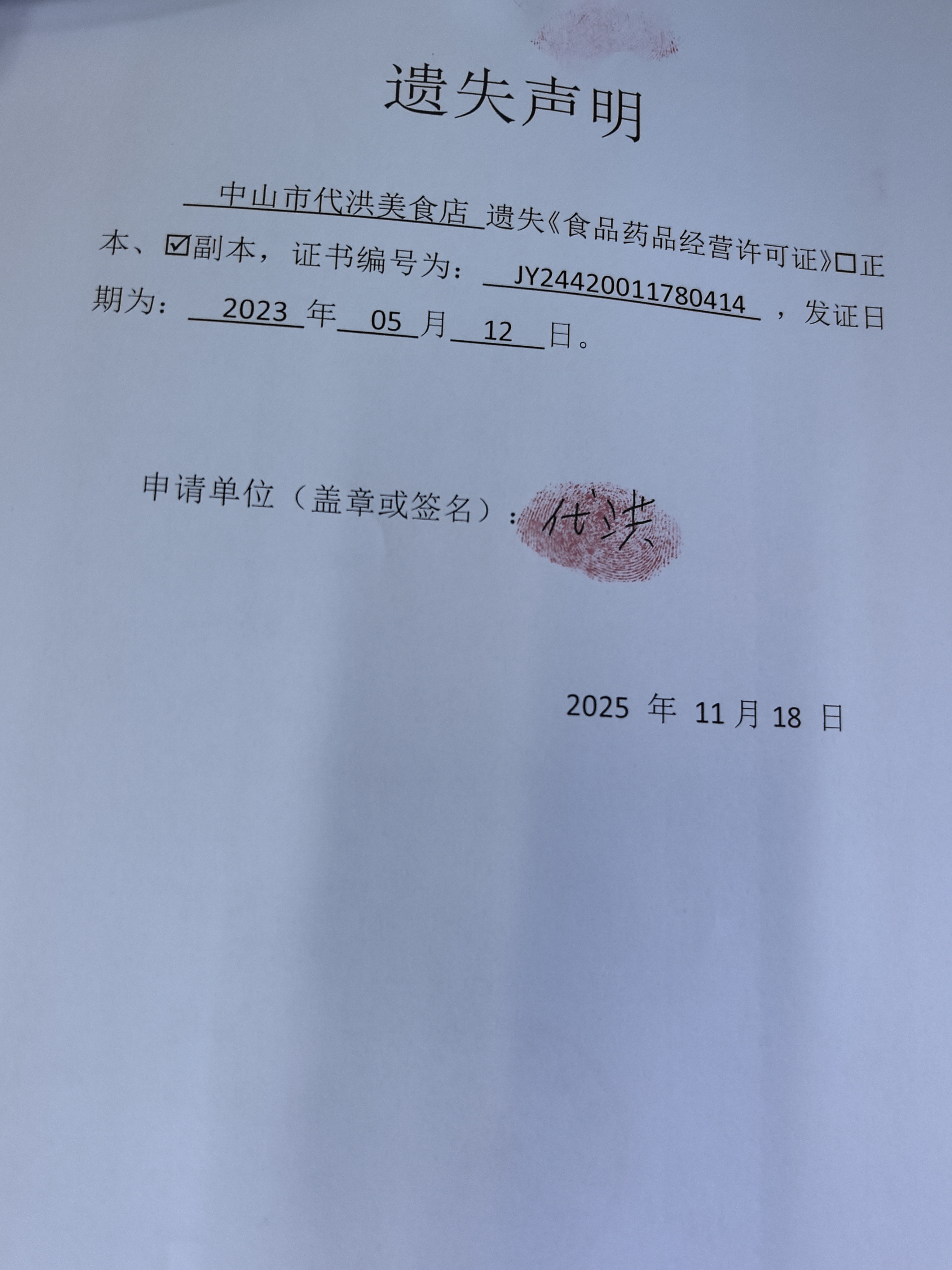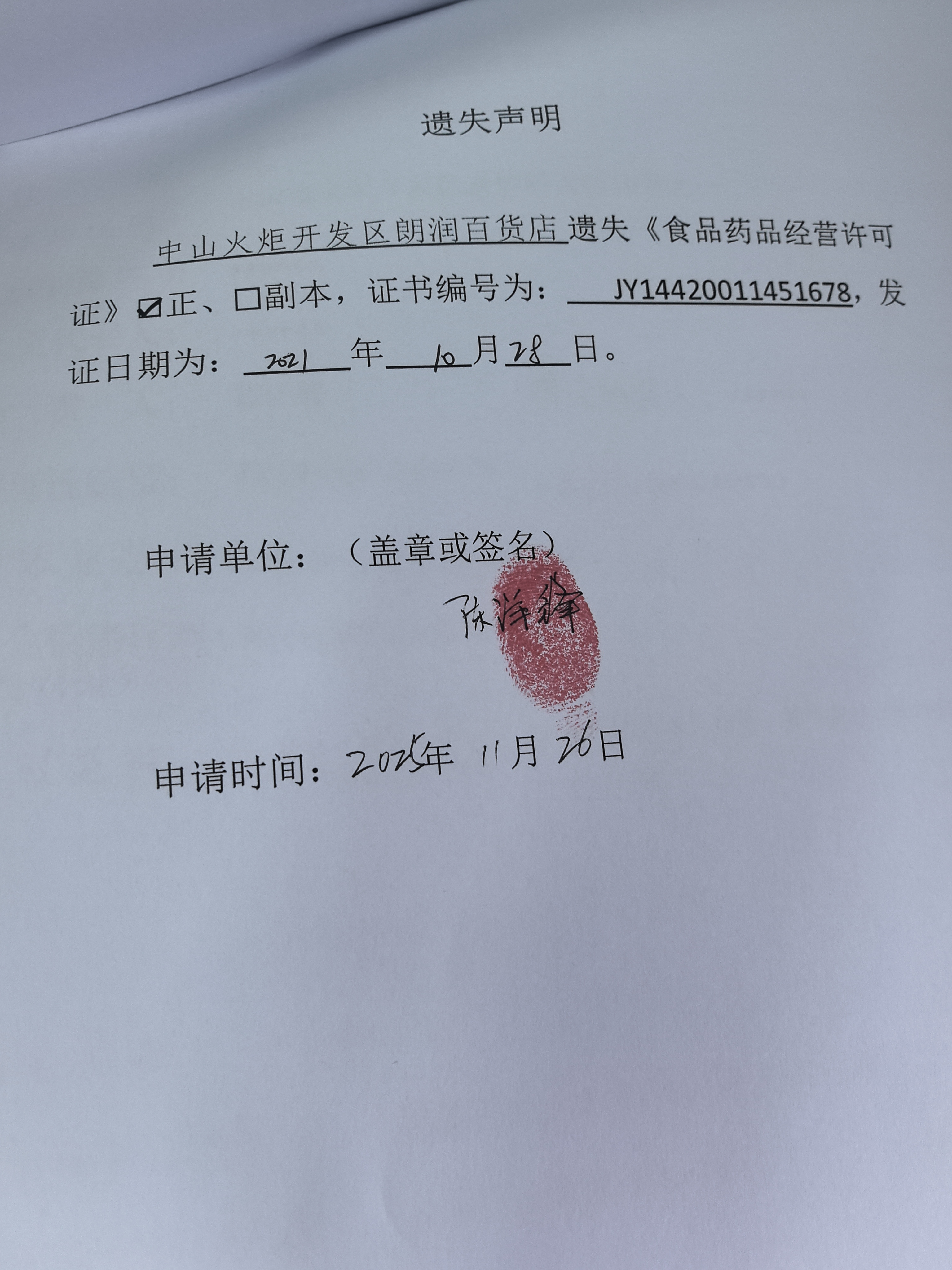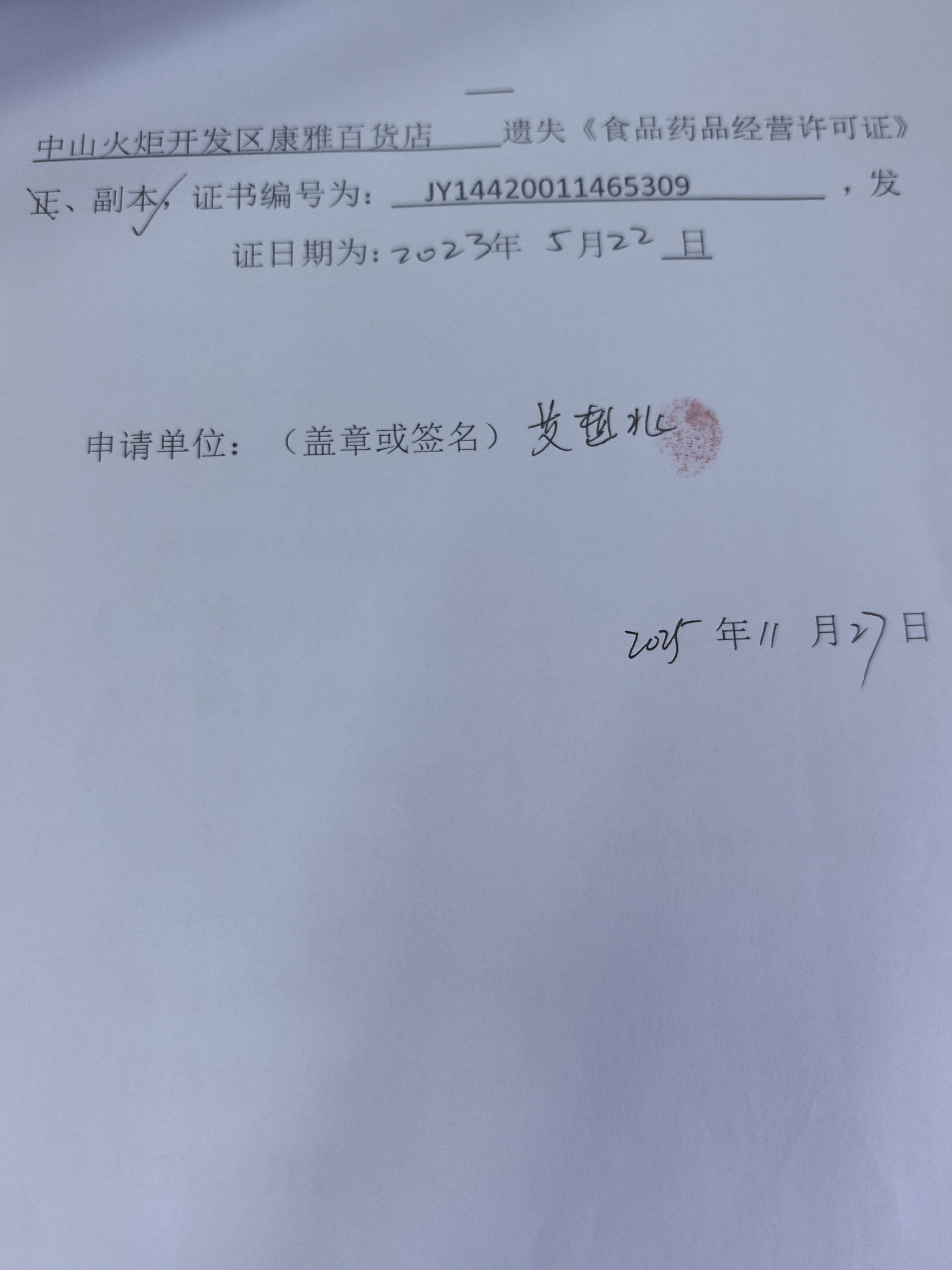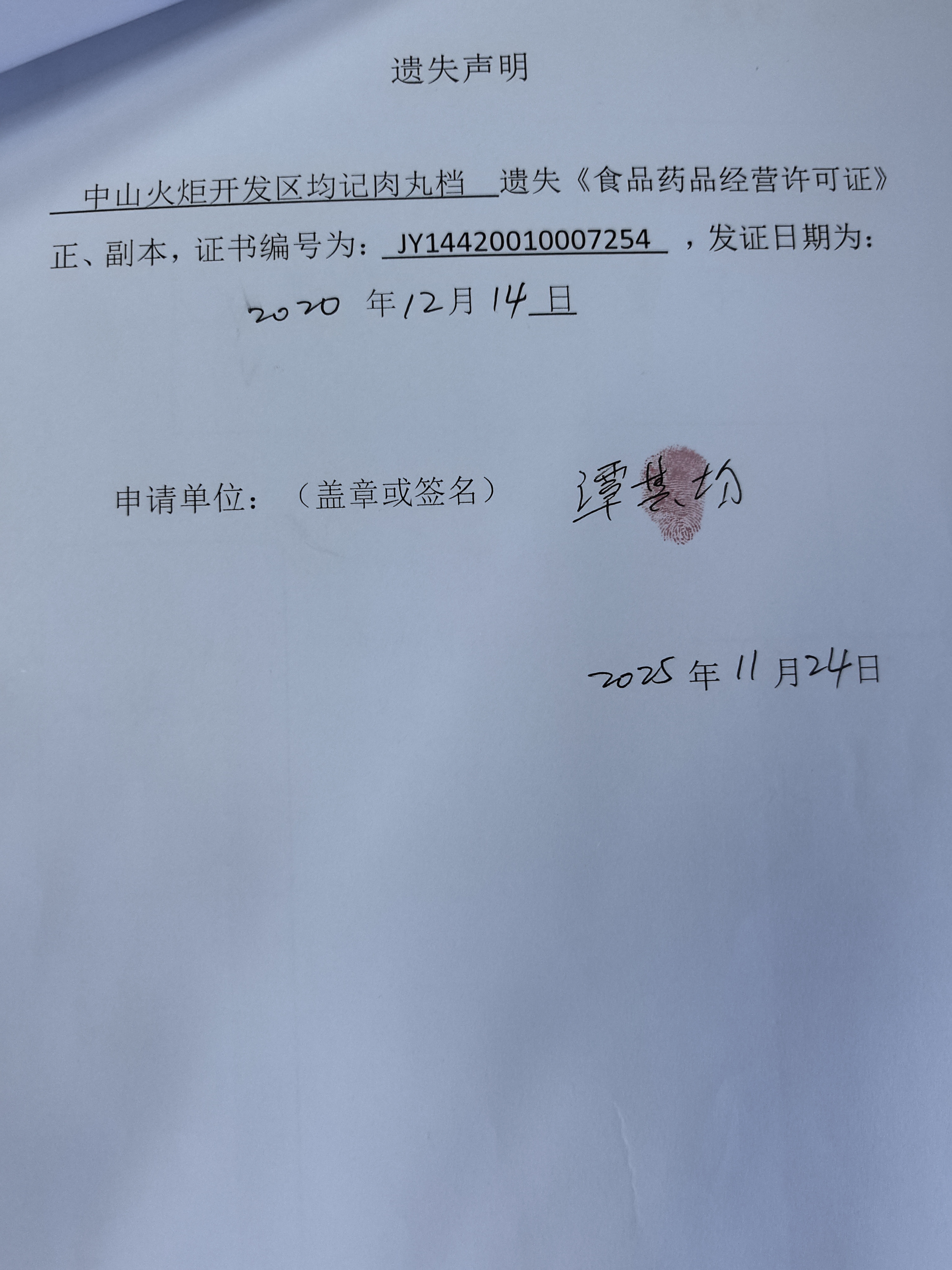 食品药品经营许可证遗失声明(中山火炬开发区均记肉丸档、中山火炬开发区康雅百货店、中山火炬开发区朗润百货店、中山市代洪美食店)