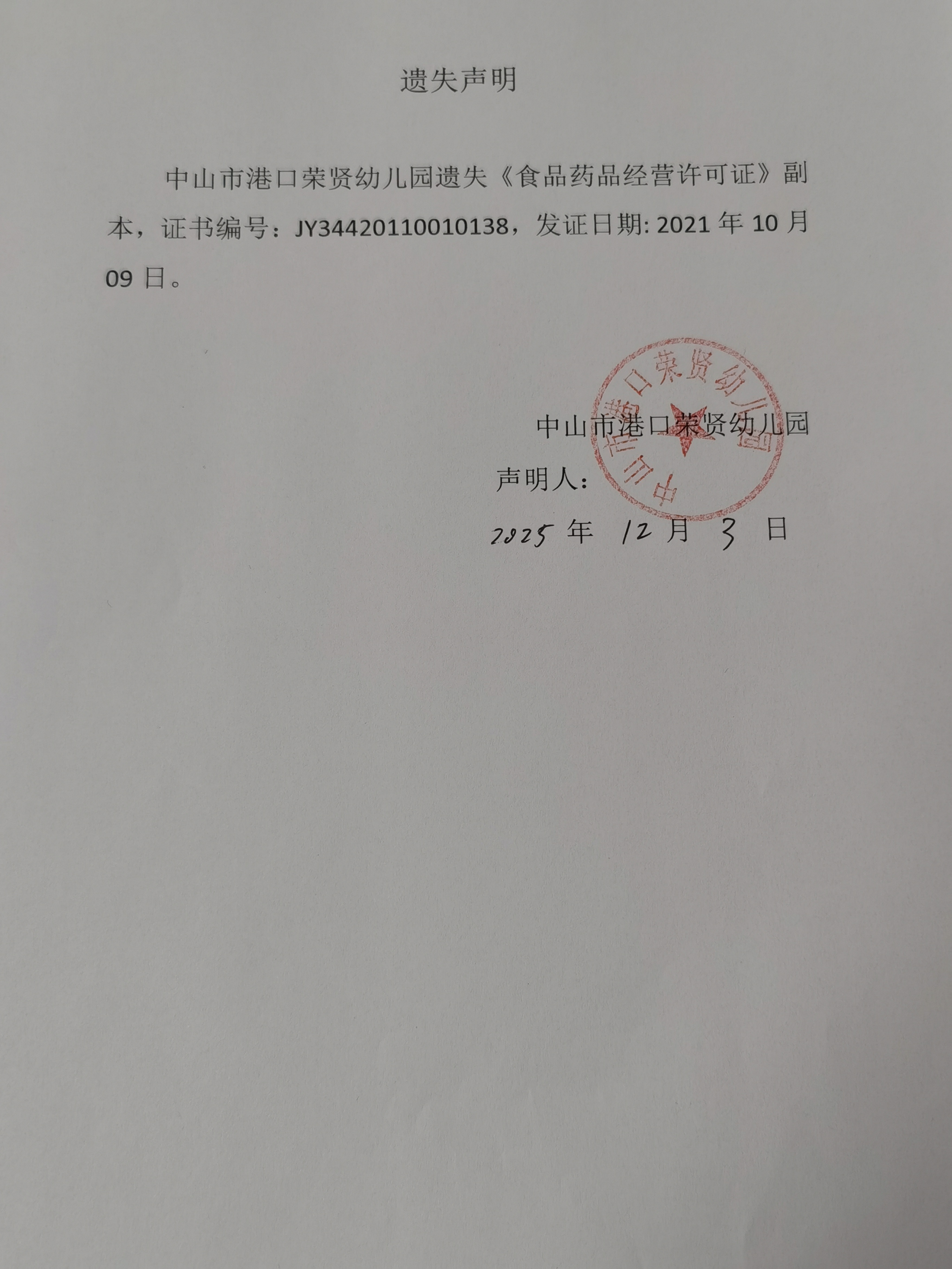 食品药品经营许可证遗失声明(中山市港口荣贤幼儿园).jpg