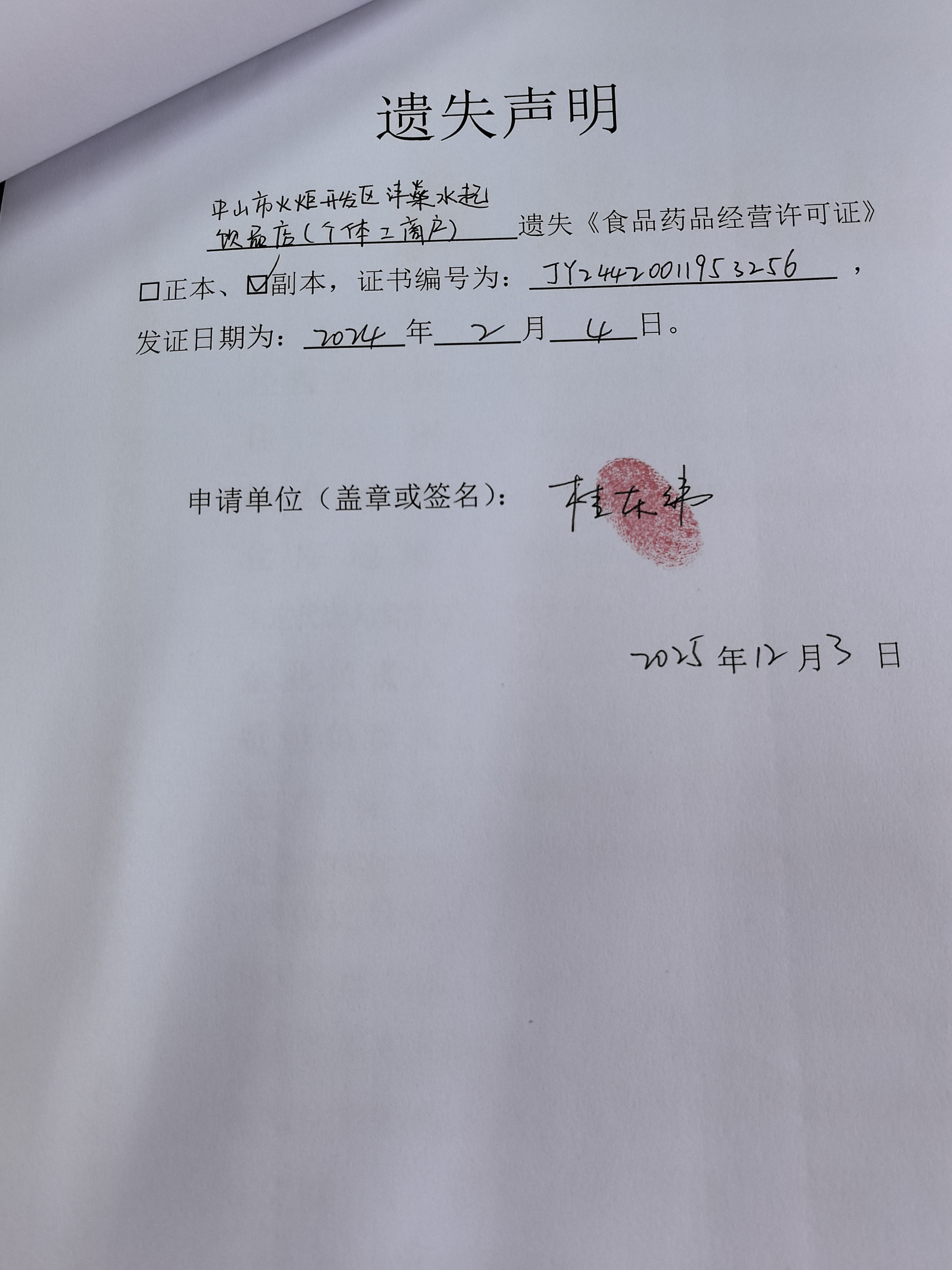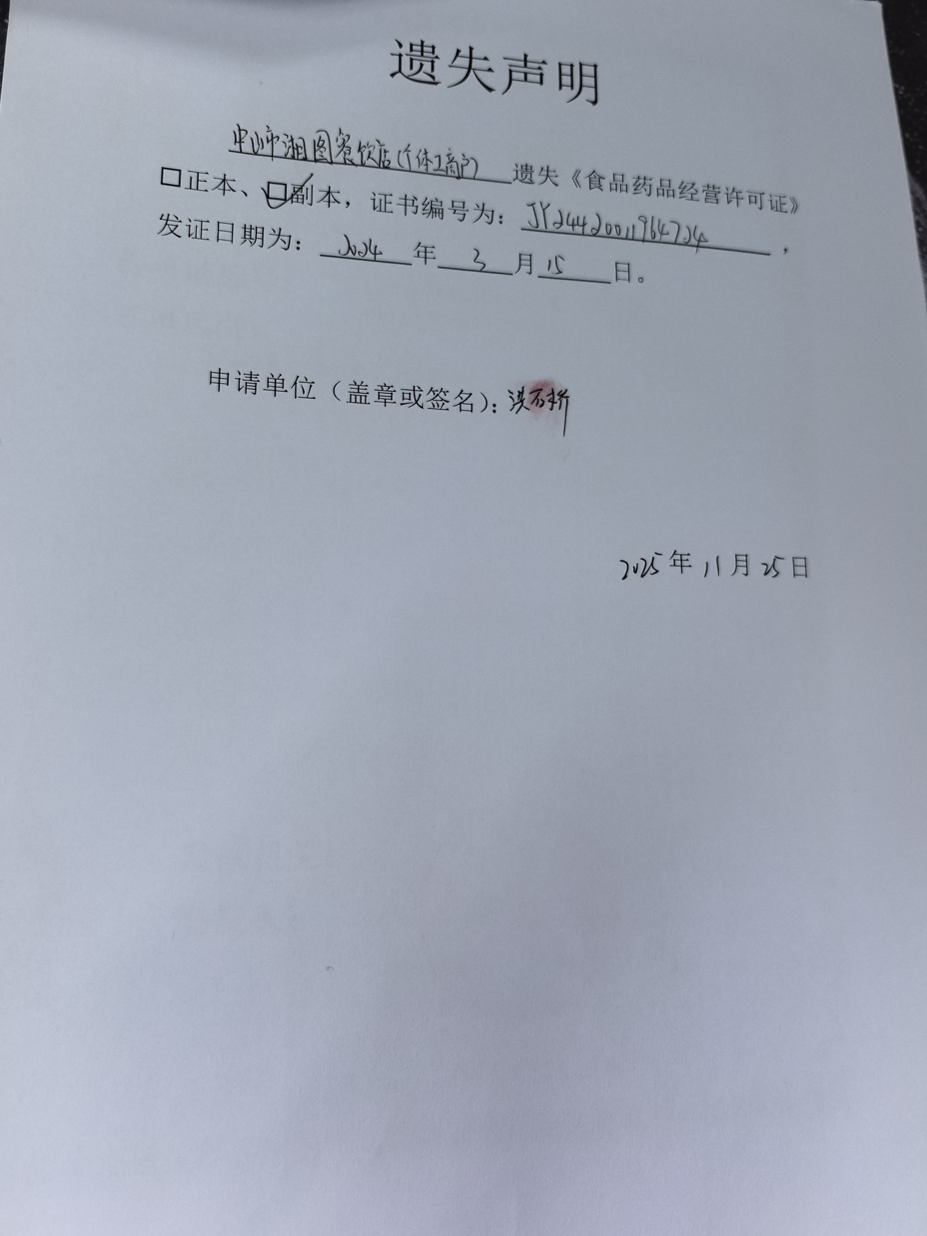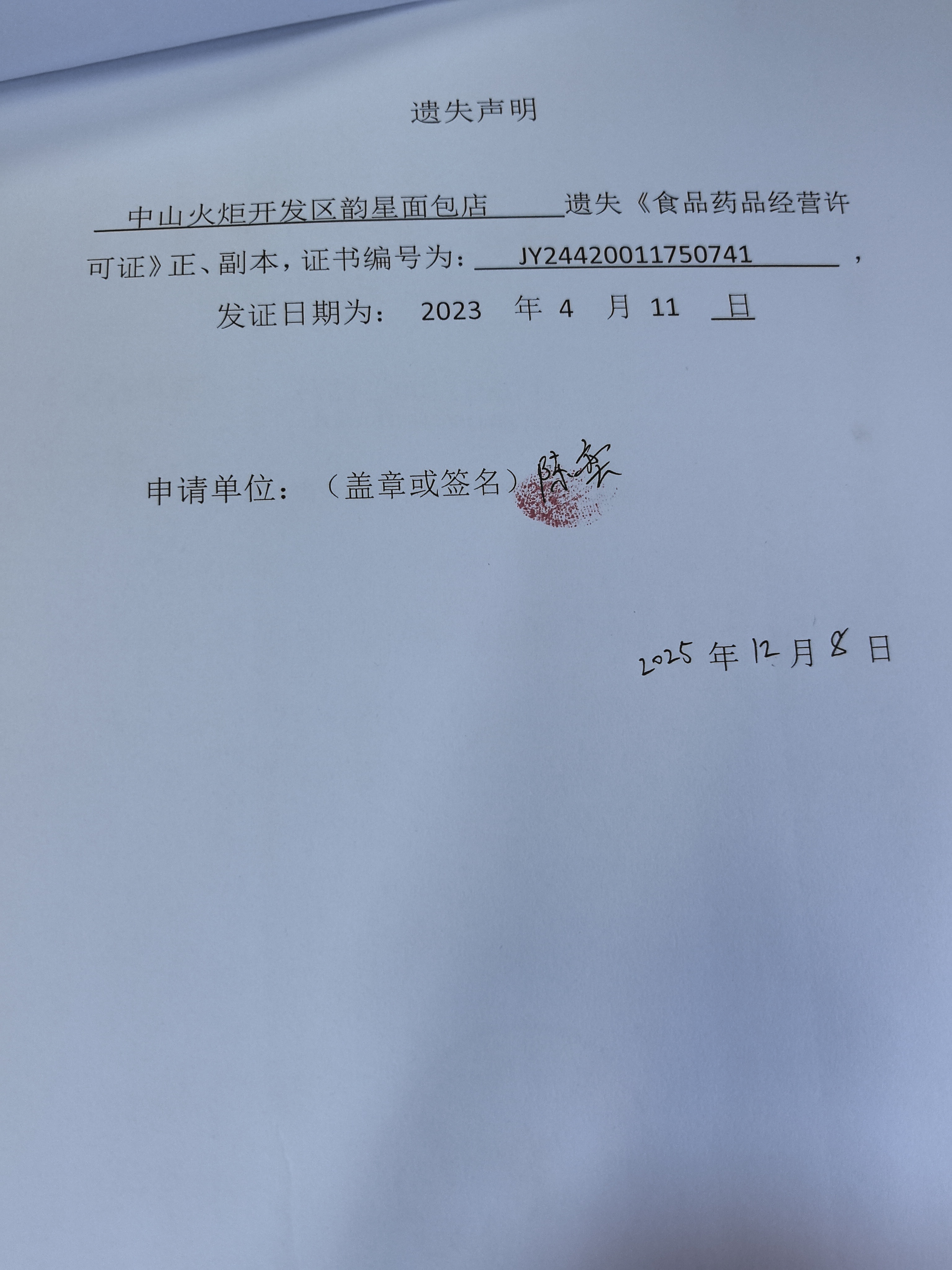 食品药品经营许可证遗失声明〔中山火炬开发区佳镁餐饮店、中山火炬开发区诺壹奶茶店、中山火炬开发区毓秀餐饮店、中山火炬开发区韵星面包店、中山市火炬开发区沣燊水起饮品店(个体工商户)、中山市湘图餐饮店(个体工商户)〕