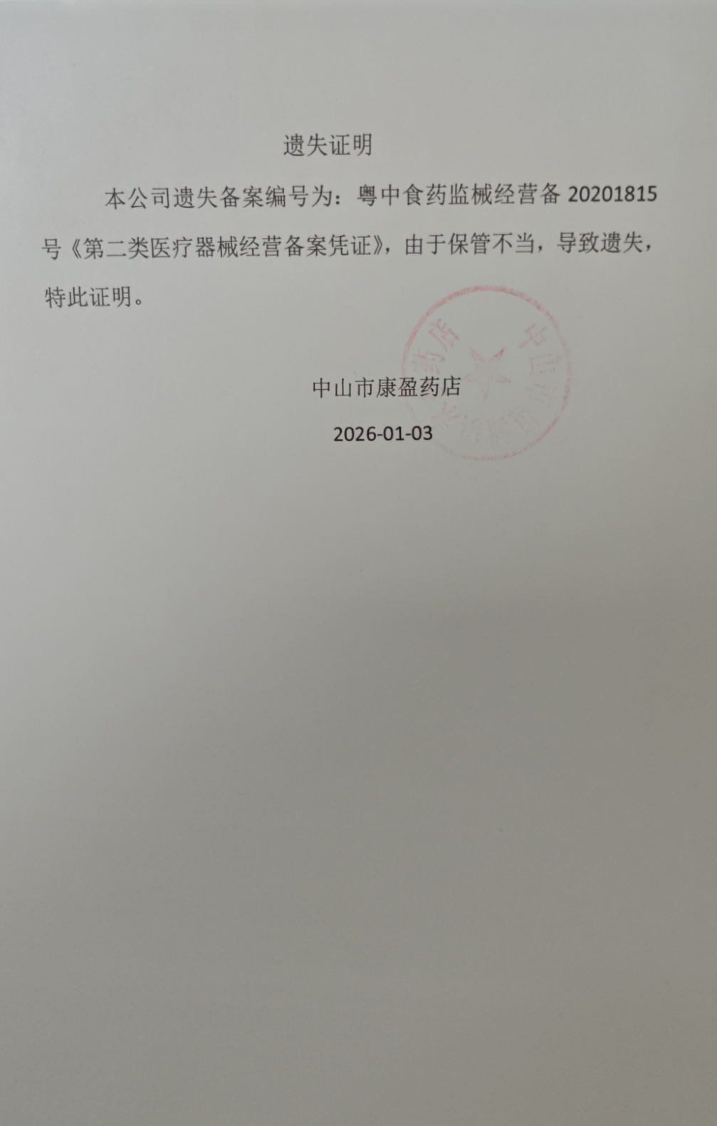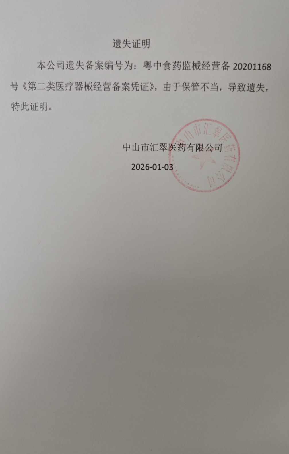 第二类医疗器械经营备案凭证遗失声明(中山市汇翠医药有限公司、中山市康盈药店)