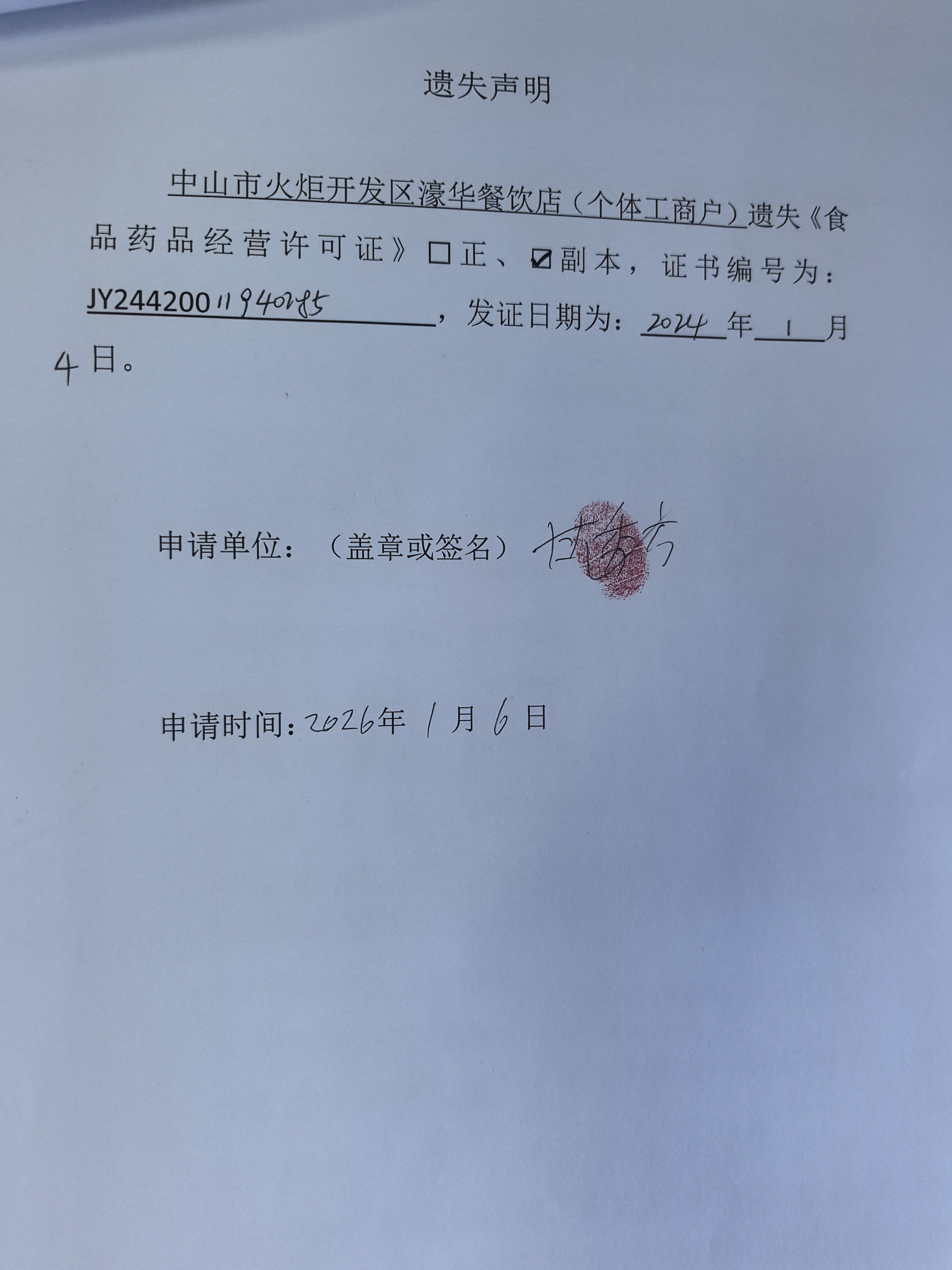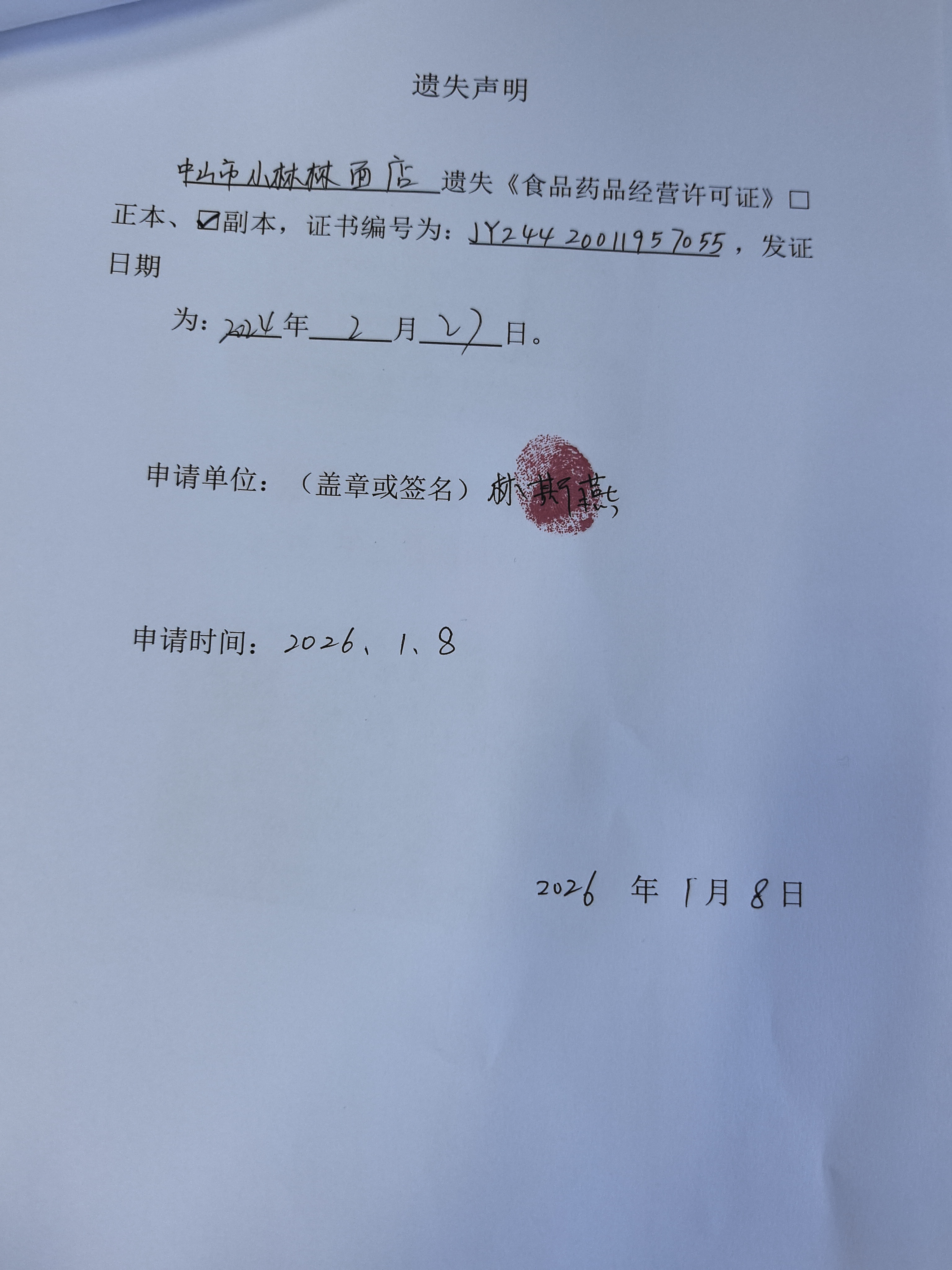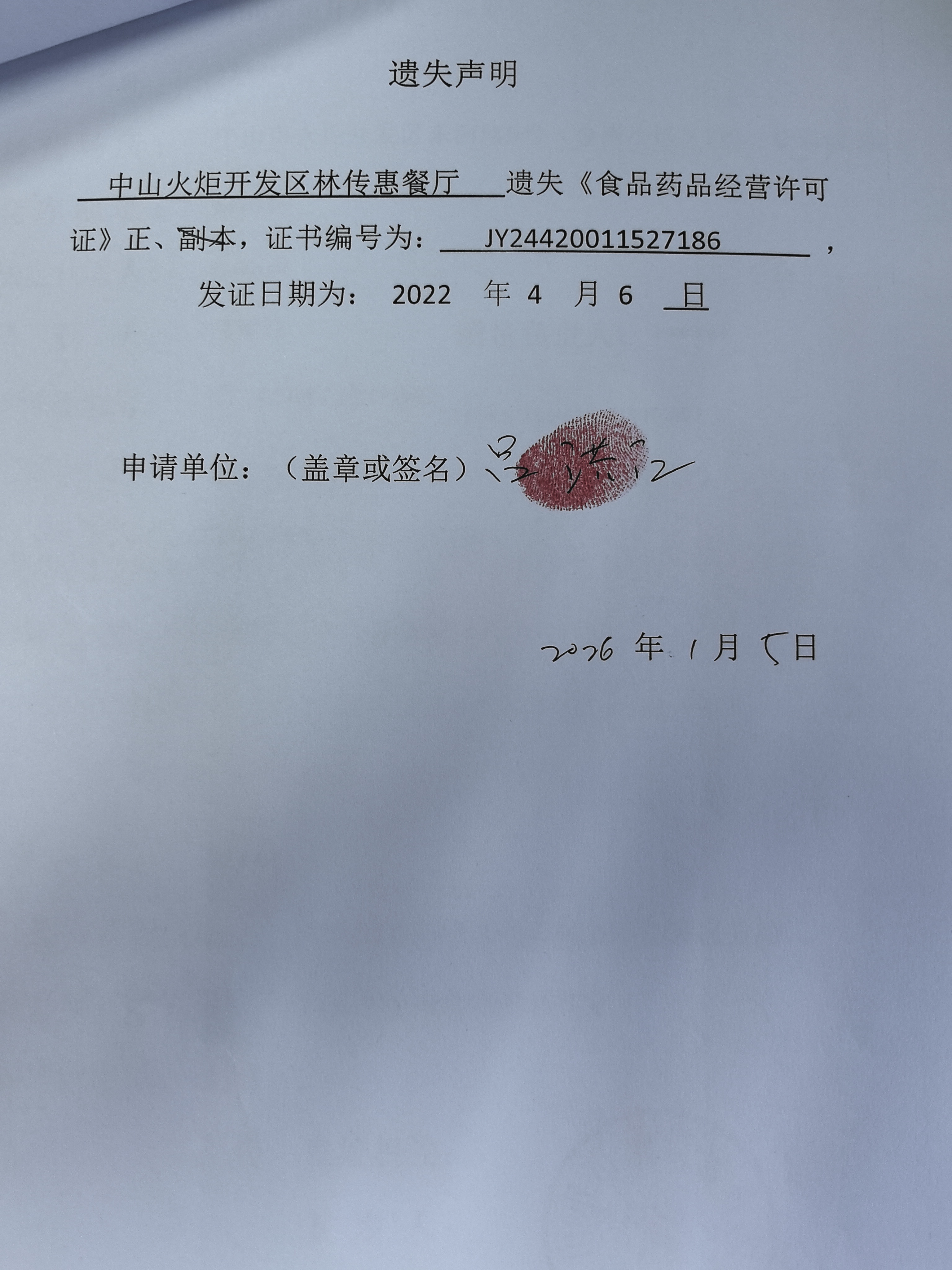 食品药品经营许可证遗失声明〔中山火炬开发区林传惠餐厅、中山市火炬开发区濠华餐饮店、中山市小林林面店(个体工商户)〕