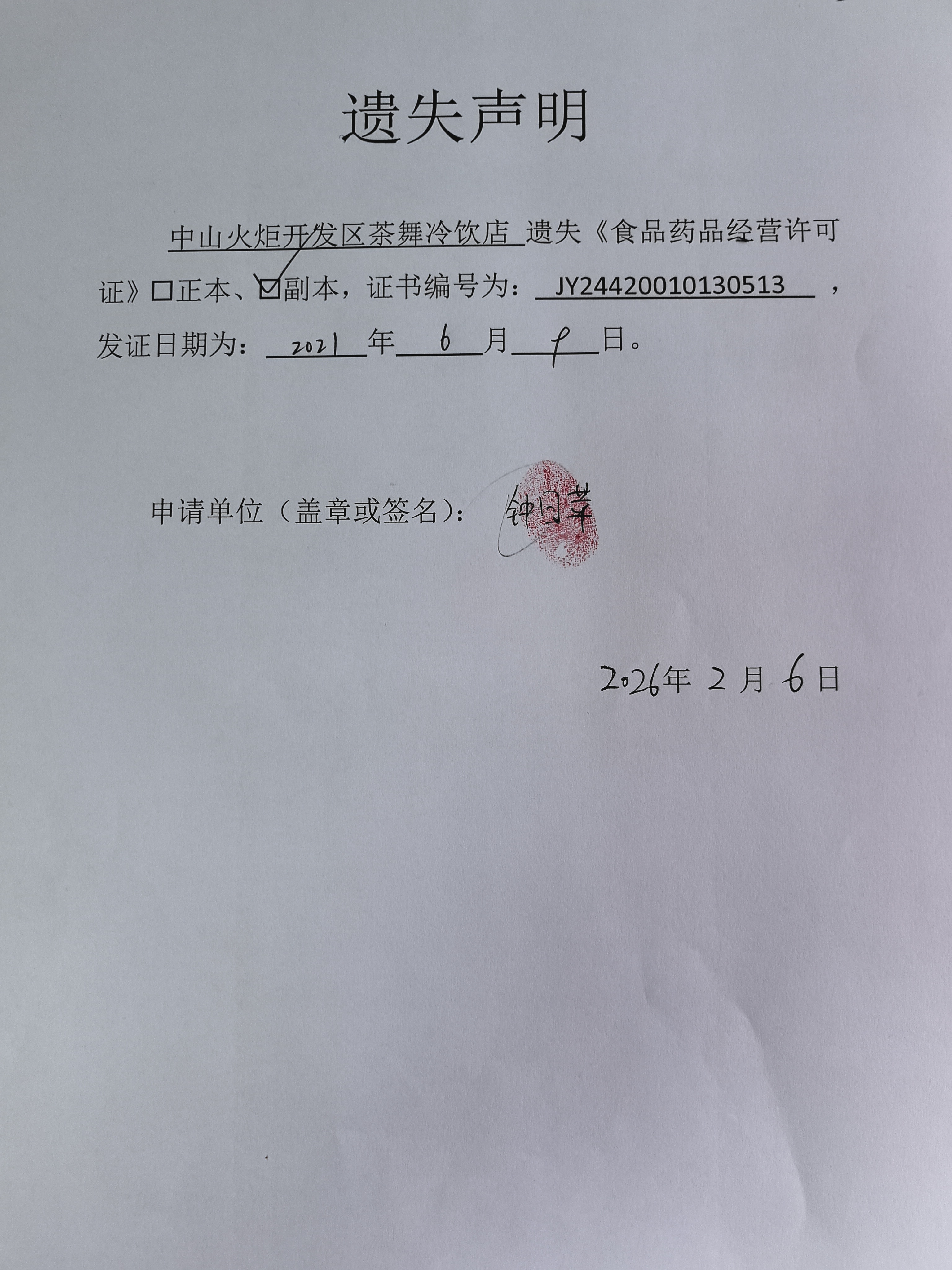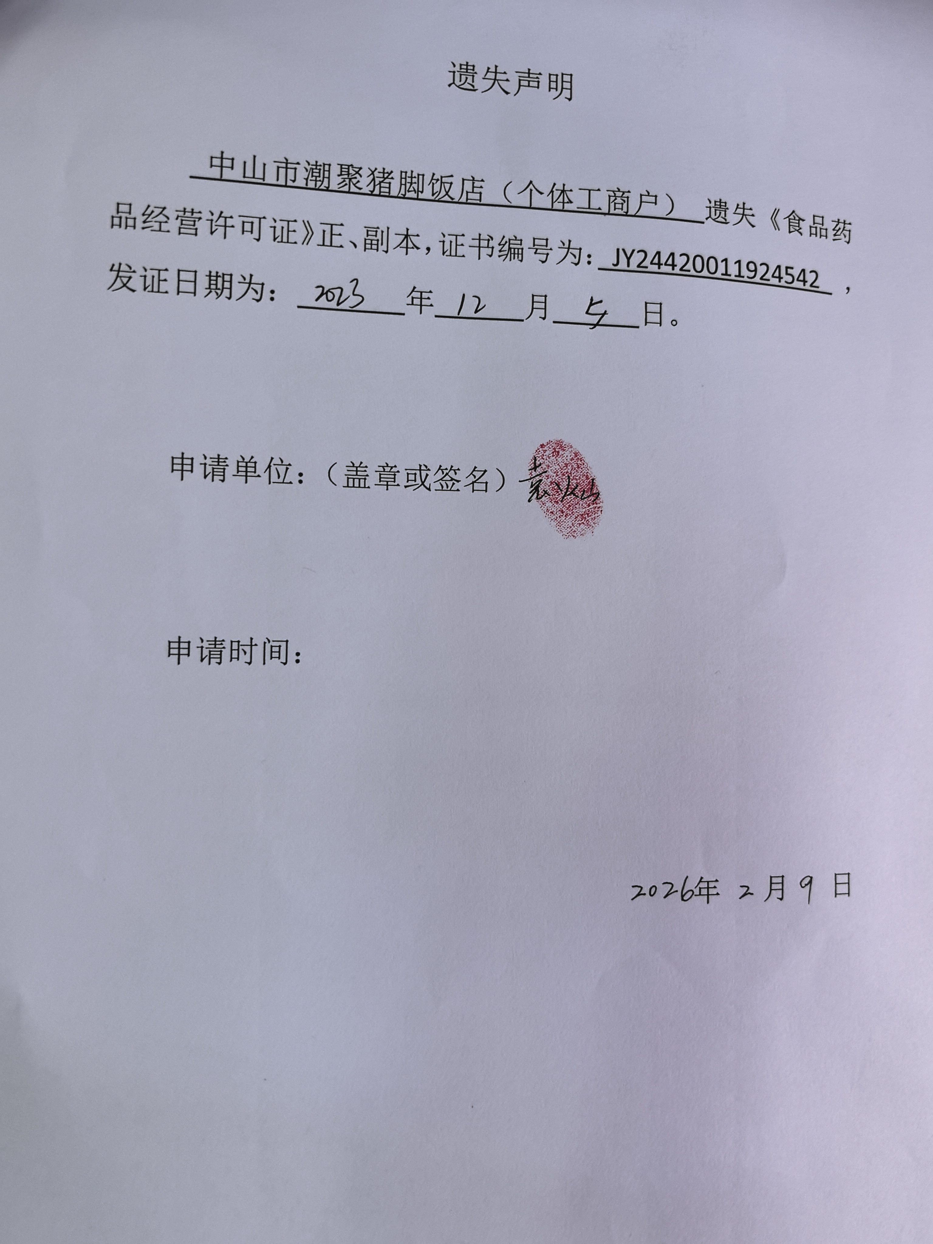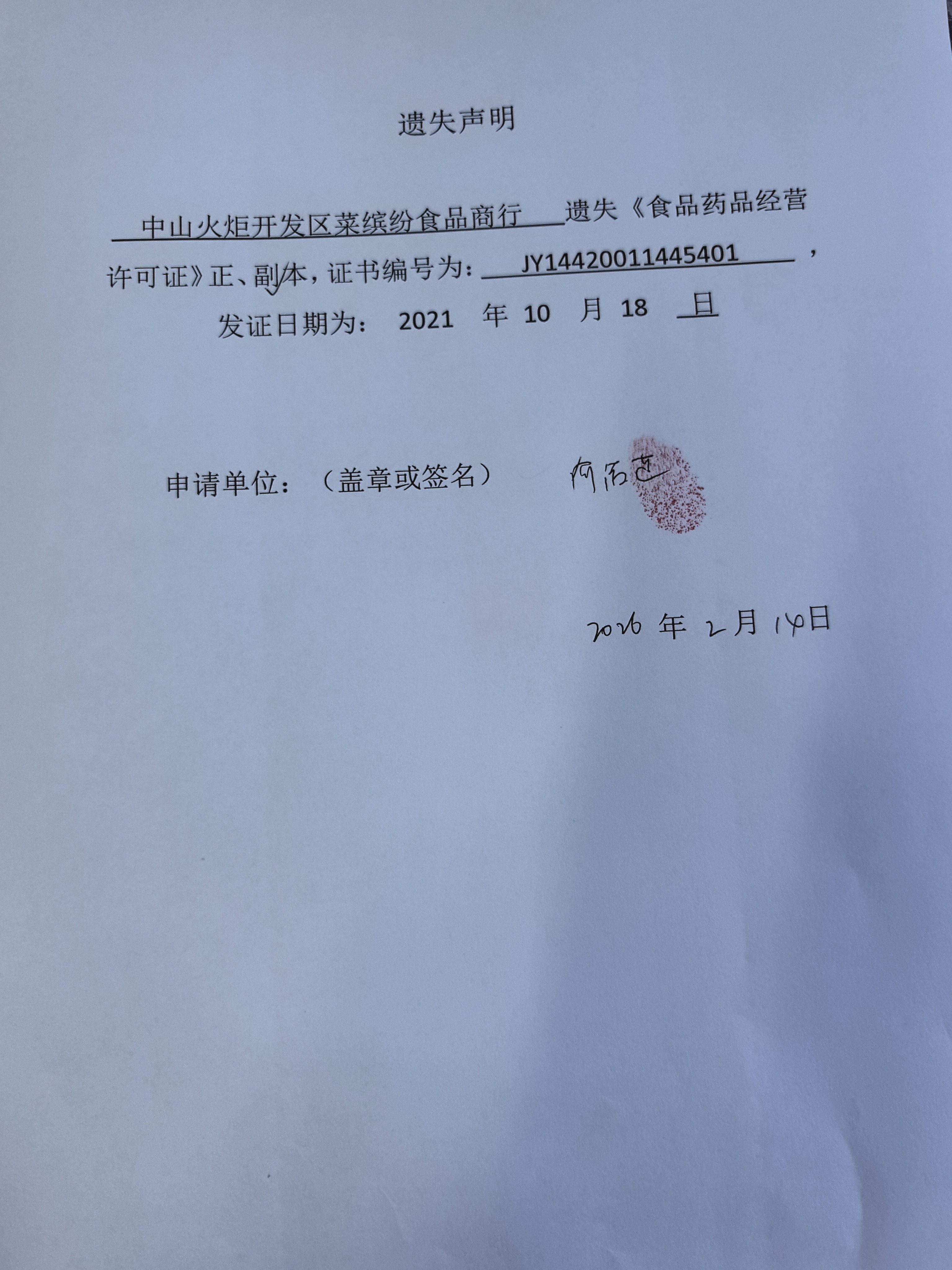 食品药品经营许可证遗失声明〔中山火炬开发区菜缤纷食品商行、中山火炬开发区茶舞冷饮店、中山火炬开发区东厨餐馆、中山市潮聚猪脚饭店(个体工商户)〕
