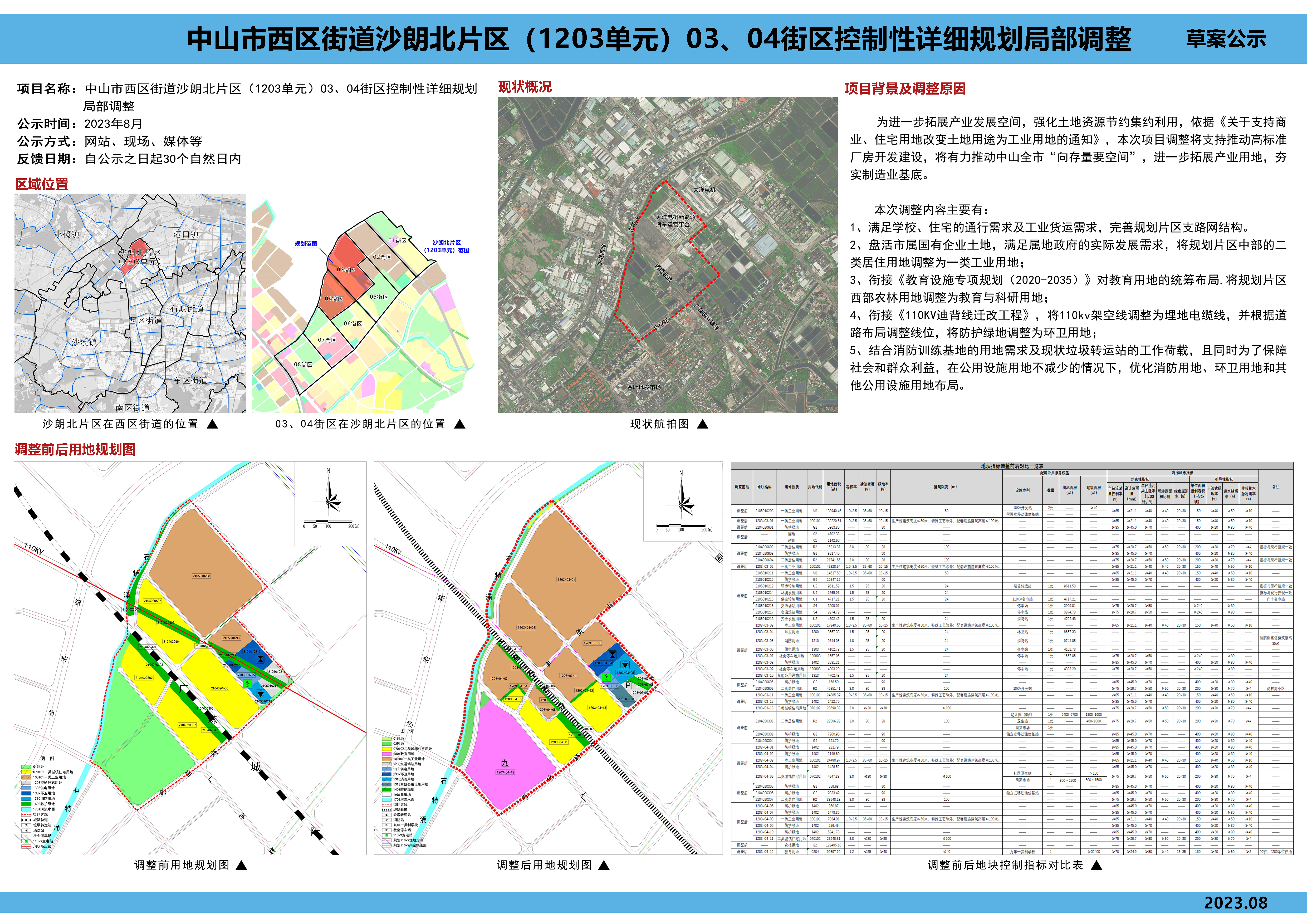 《中山市西区街道沙朗北片区(1203单元)03、04街区控制性详细规划局部调整》草案已编制完成。根据《中华人民共和国城乡规划法》等相关法规要求,现对该草案予以公示。