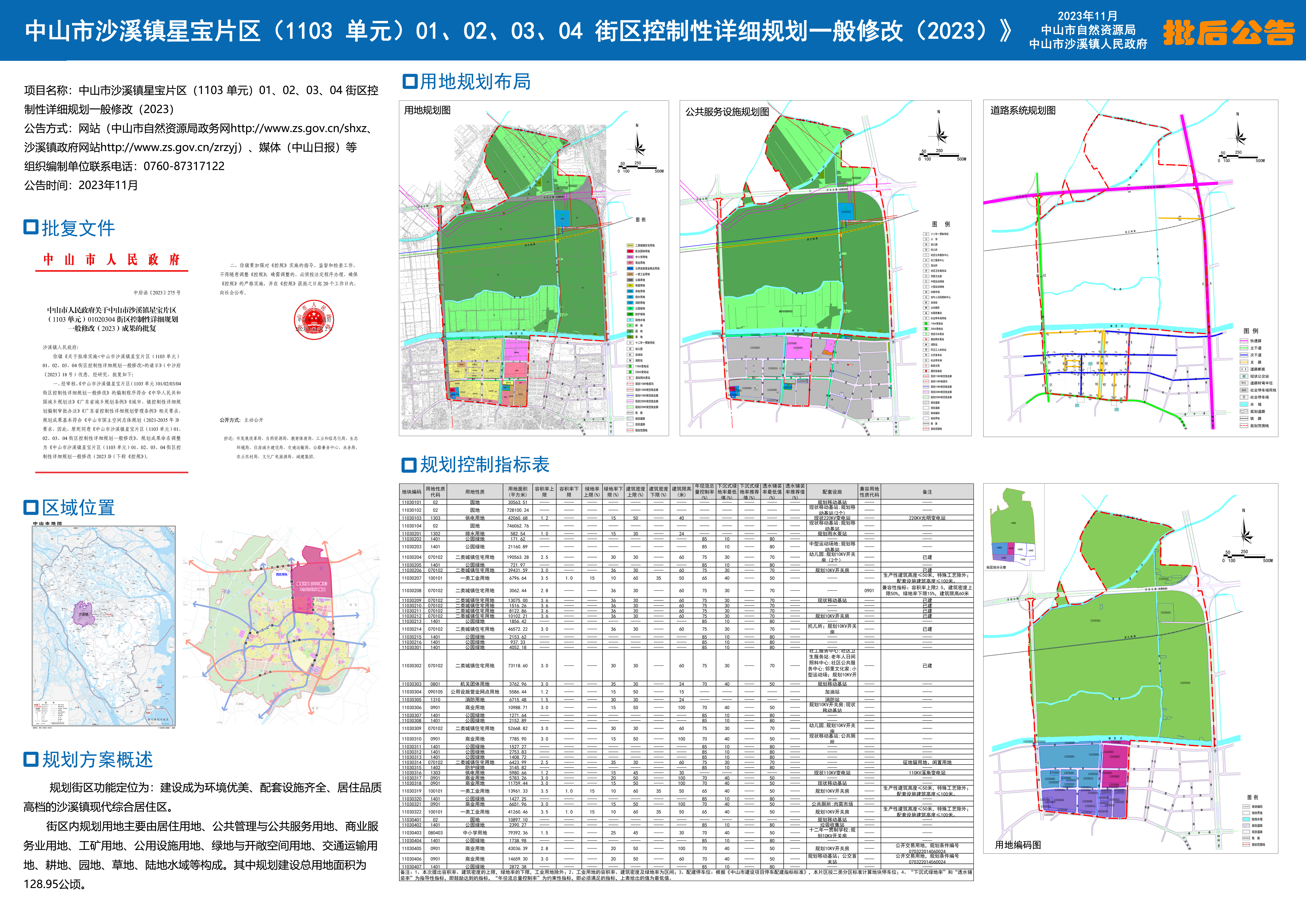 《中山市沙溪镇星宝片区(1103单元)01、02、03、04街区控制性详细规划一般修改(2023)》已经中山市人民政府审批通过,自批准之日起实施,现根据《中华人民共和国城乡规划法》等相关法律、法规要求予以批后公布。广大市民可到《中山日报》、中山市自然资源局网站(http://www.zs.gov.cn/zrzyj/)、沙溪镇政府网站(http://www.zs.gov.cn/shxz)上查阅情况。
