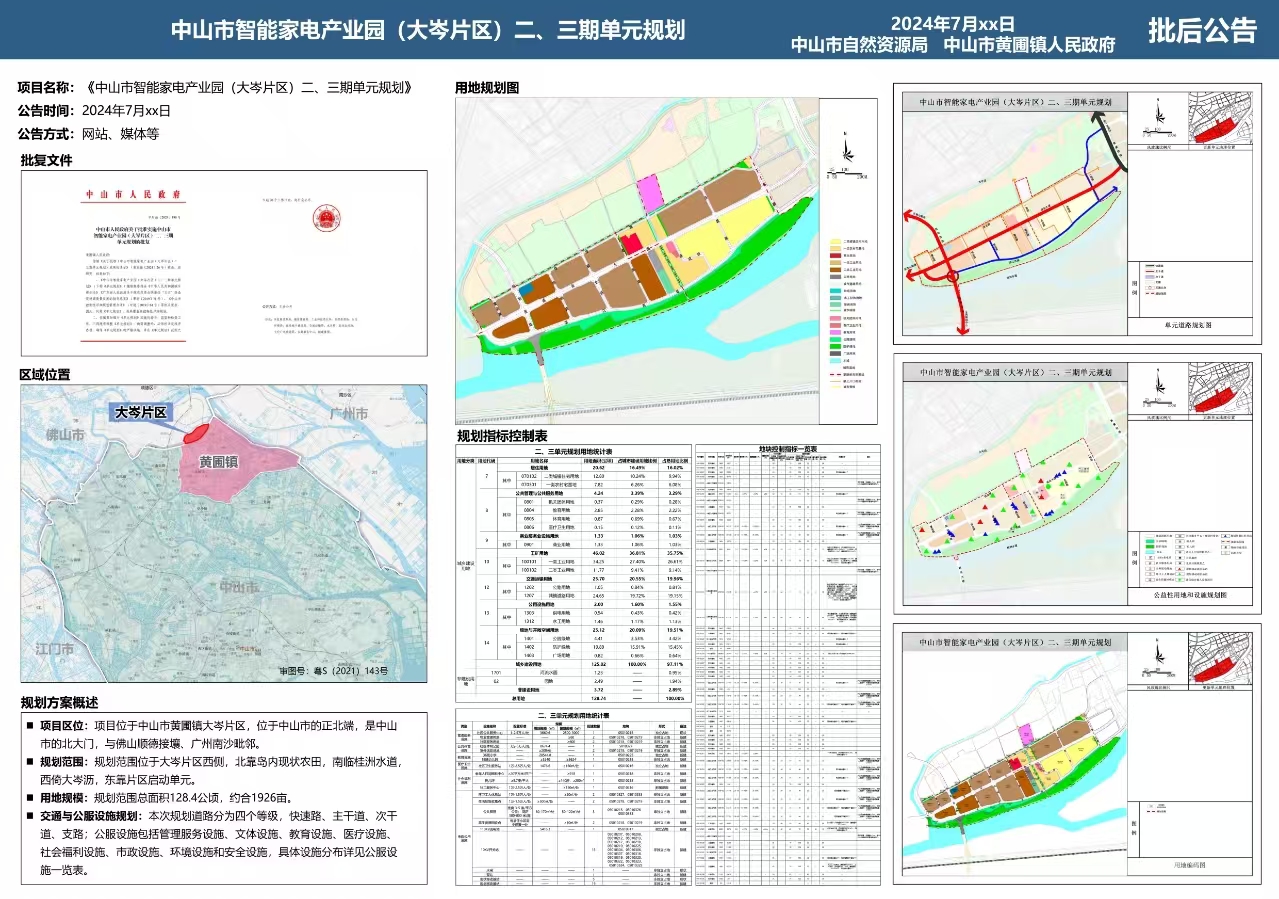 《中山市智能家电产业园(大岑片区)二、三期单元规划》经中山市人民政府批复(中府函〔2024〕198号),自批复之日起实施。现根据《中华人民共和国城乡规划法》等相关法律法规要求予以批后公布,有关规划成果内容可在中山市自然资源局网站(http://www.zs.gov.cn/zrzyj/)、中山市黄圃镇人民政府网站(http://www.zs.gov.cn/hpz/)查询。