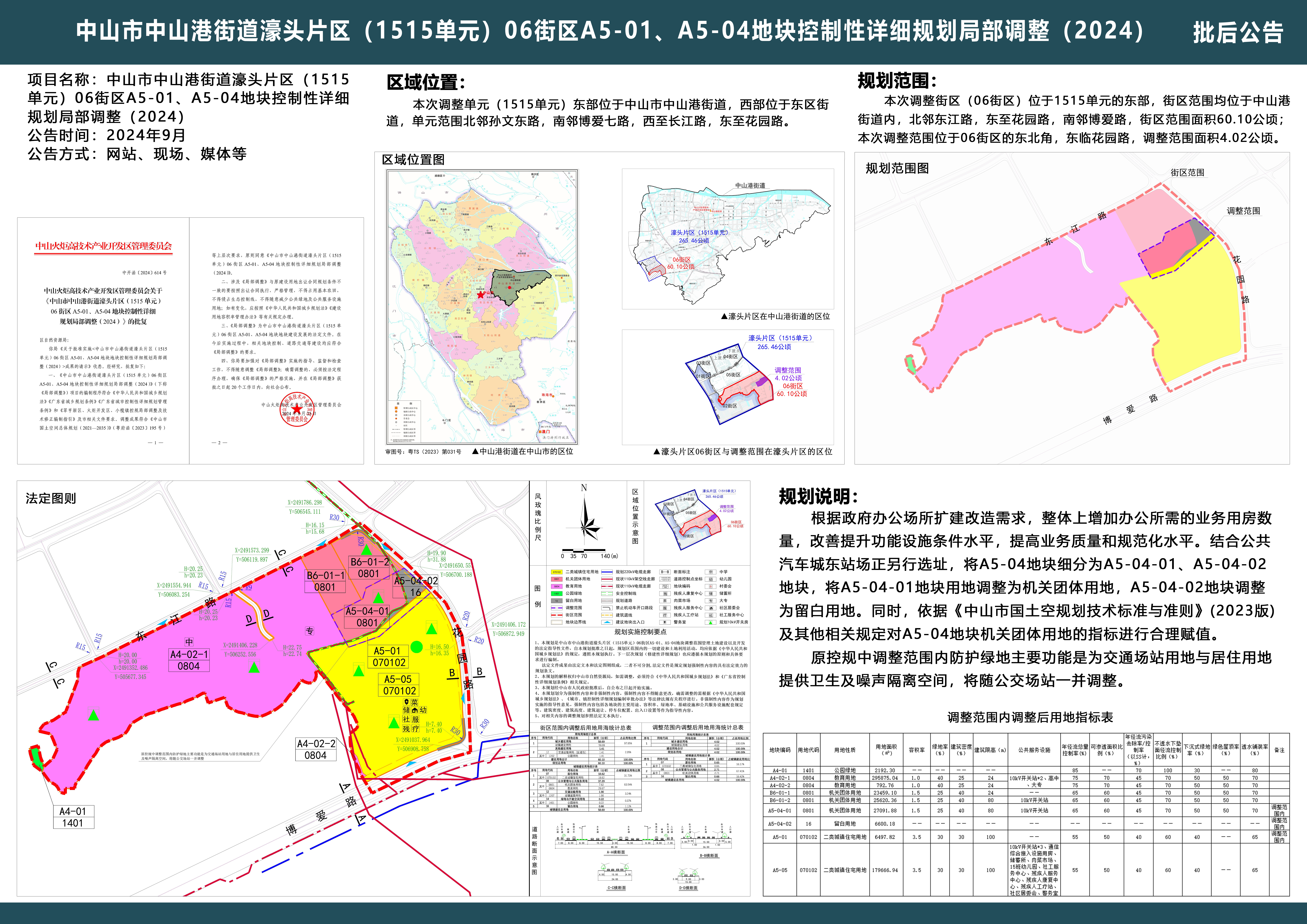 《中山市中山港街道濠头片区(1515单元)06街区A5-01、A5-04地块控制性详细规划局部调整(2024)》成果已通过中山火炬高技术产业开发区管理委员会审批。现按照相关要求,对该成果予以公布。广大市民或与之存在相关利害关系人(单位、组织)可登录中山火炬高技术产业开发区管委会政务网站、中山市自然资源局网站查阅规划情况。