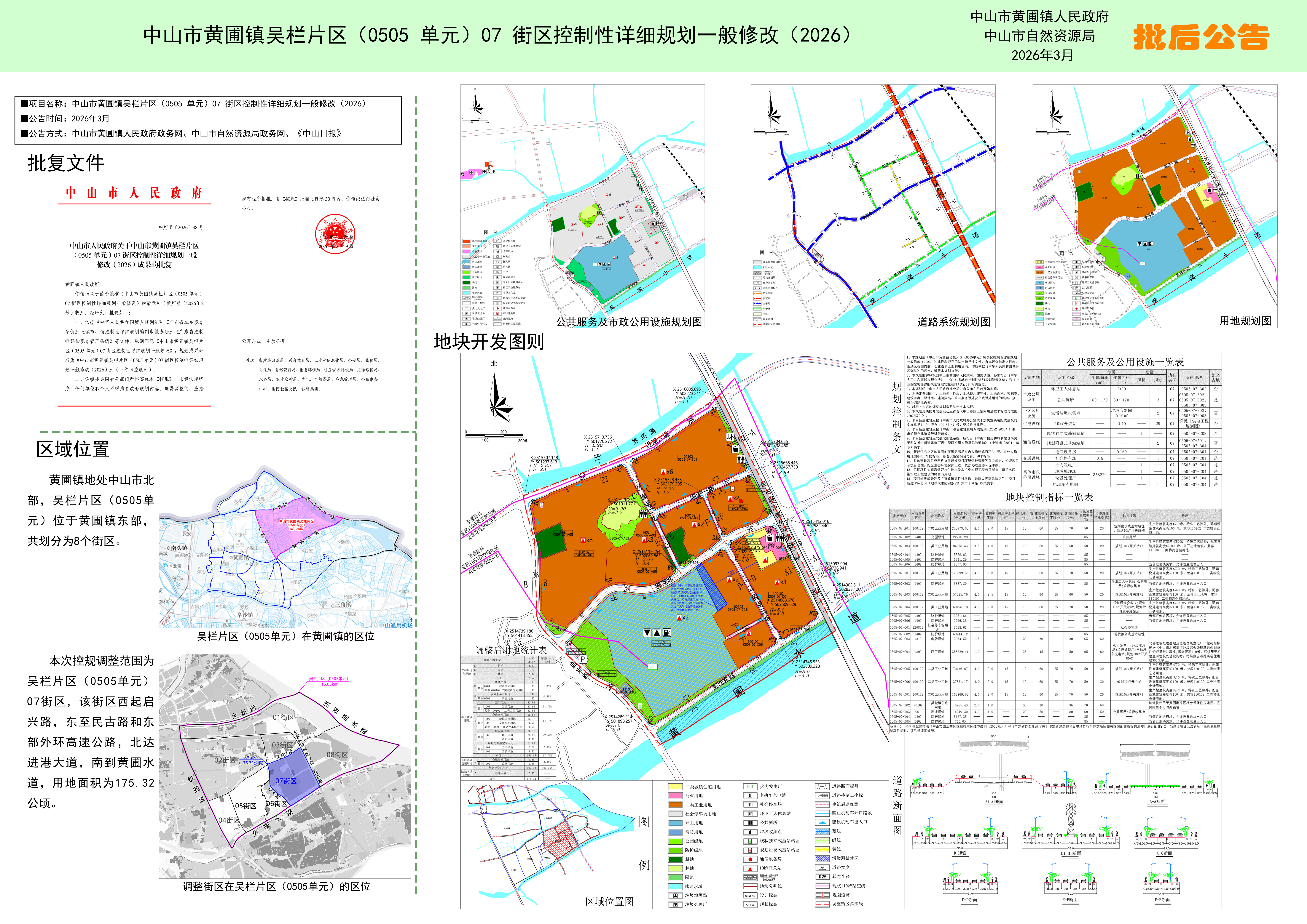 《中山市黄圃镇吴栏片区(0505单元)07街区控制性详细规划一般修改(2026)》经中山市人民政府批准,批复文号为:中府函[2026]38号。根据《中华人民共和国城乡规划法》等文件规定,现将成果公布,欢迎社会公众查询、监督实施。