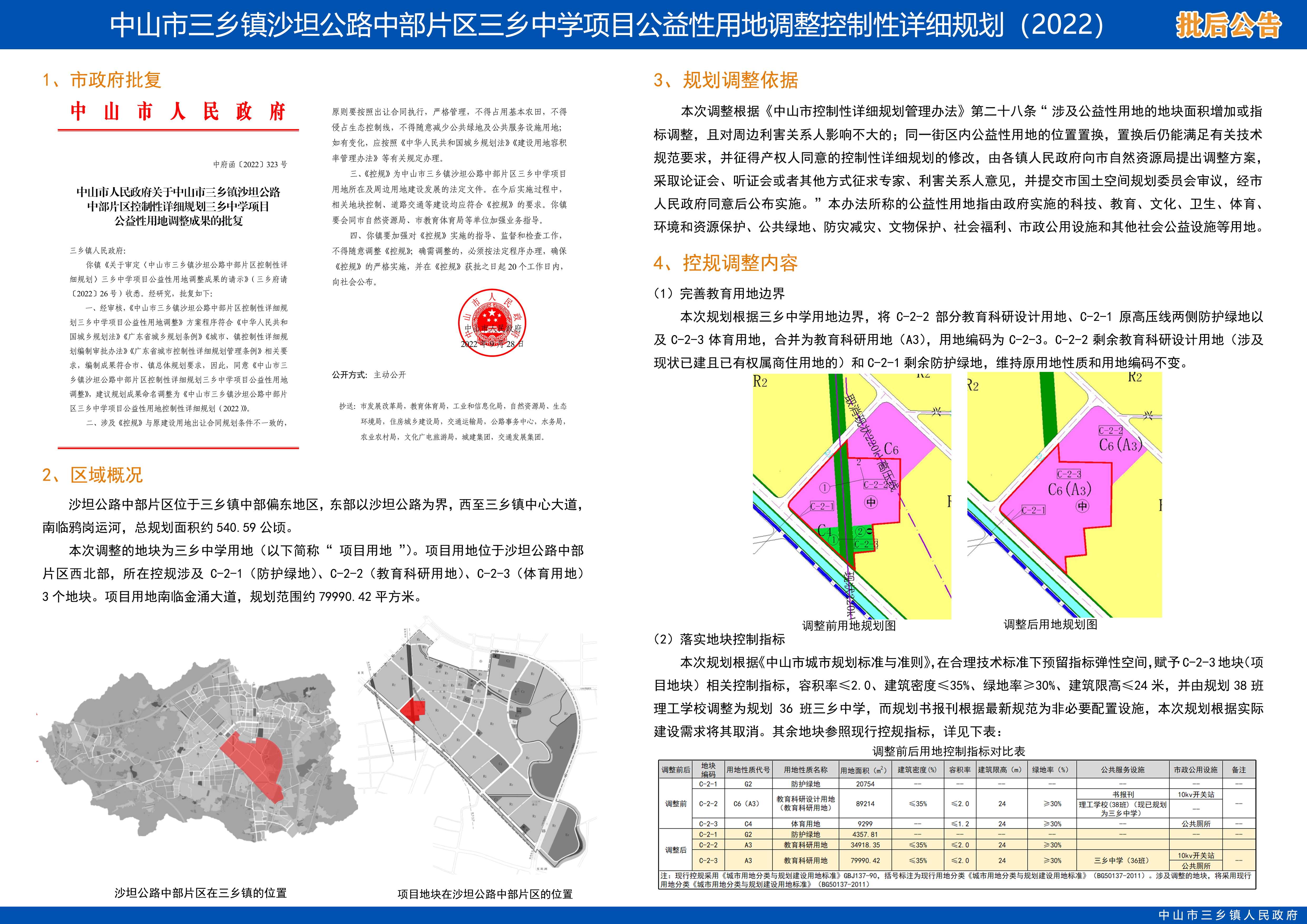 附件:《中山市三乡镇沙坦公路中部片区三乡中学项目公益性用地控制性详细规划(2022)》成果批后公告