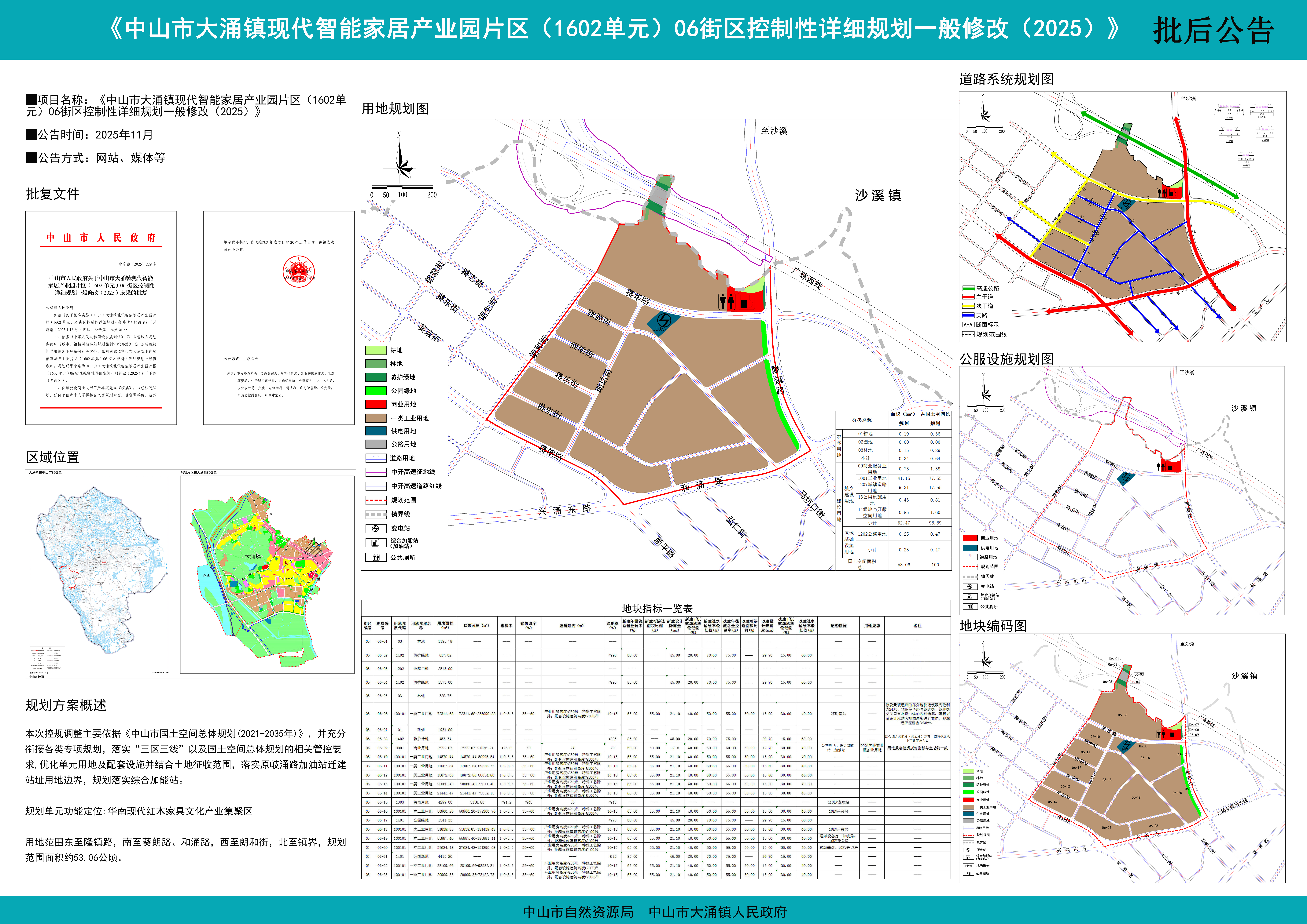 附件:《中山市大涌镇现代智能家居产业园片区(1602单元)06街区控制性详细规划一般修改(2025)》批后公告