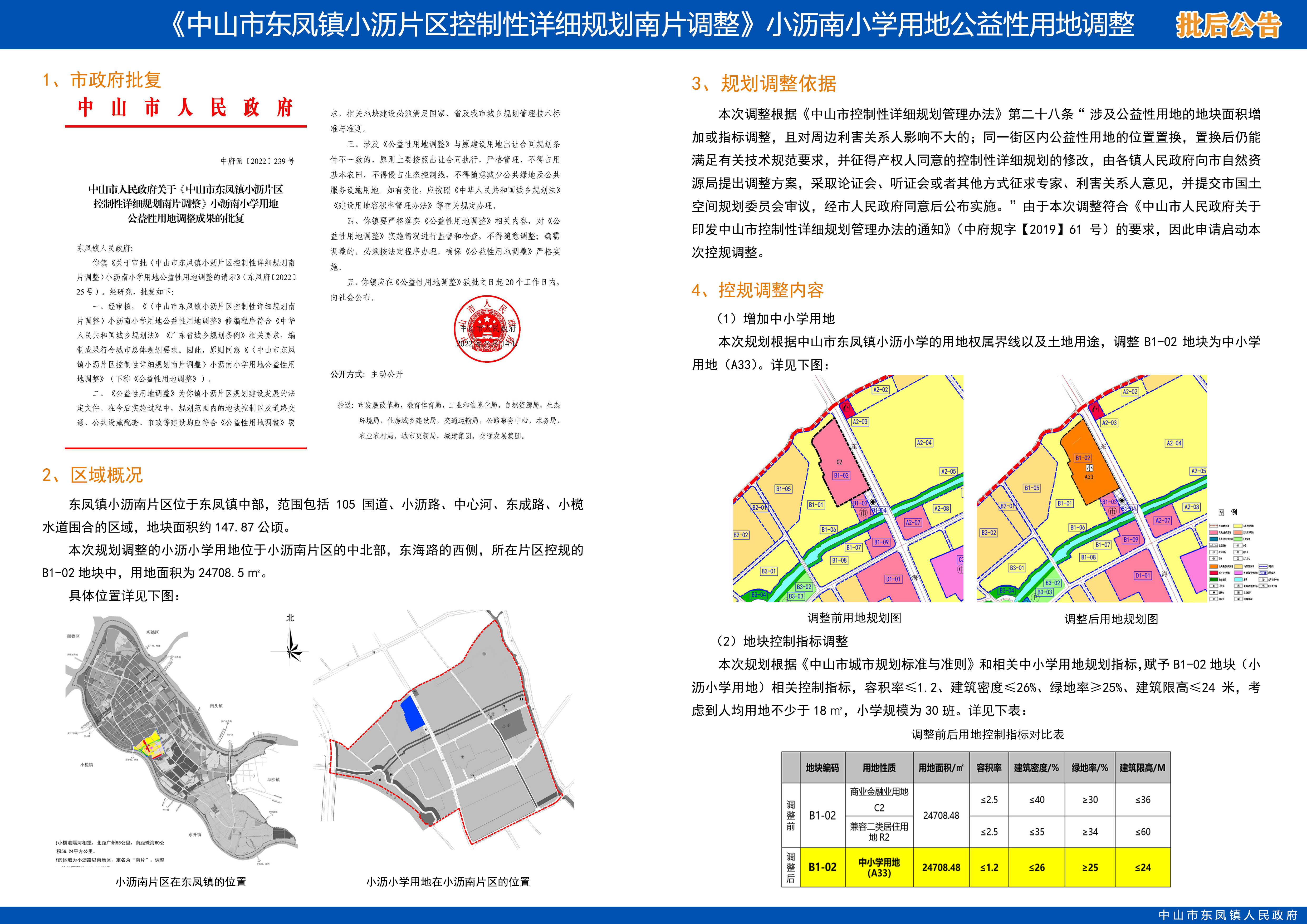 《〈中山市东凤镇小沥片区控制性详细规划南片调整〉小沥南小学用地公益性用地调整》业经中山市人民政府批准实施(见附件中府函〔2022〕239号)。现根据《中华人民共和国城乡规划法》等相关法律、法规要求予以批后公布。广大市民可到东凤镇城市更新和建设服务中心或登录中山市自然资源局网站(http://www.zs.gov.cn/zrzyj/)、东凤镇政府网站(http://www.zs.gov.cn/dfz/ghtj/)查阅相关规划情况。