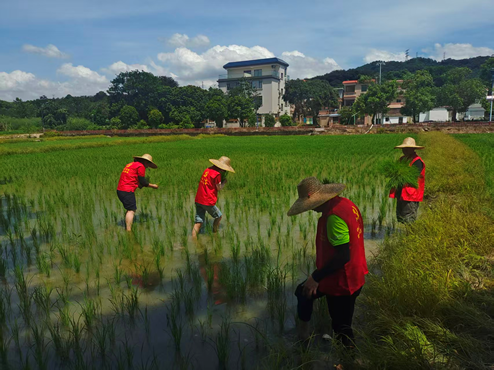 8月29日,南朗供销社党支部组织党员志愿者,到翠亨攸福隆村水稻田协助农民补栽秧苗、清理田间杂草。