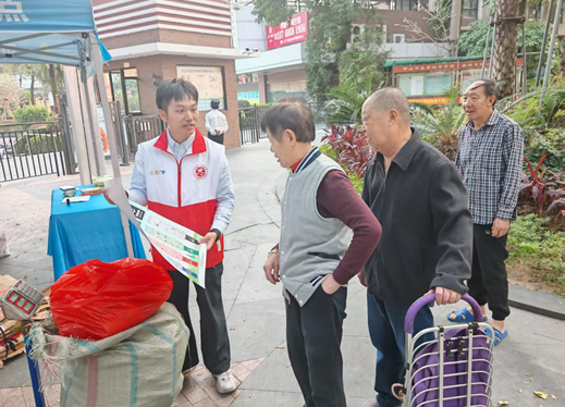 12月5日,市供销新宝公司到南区街道米兰阳光小区开展垃圾分类志愿服务活动,向小区居民介绍可回收物网点功能。