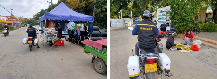 行动中,交通安全巡查员重点对村内主要道路——岗咀路进行巡查,发现该道路上存在占道经营问题,影响道路交通环境,巡查员立即劝导路边占道经营的群众尽快清理场地离开,并派发《中山市文明行为促进条例》,告知群众乱摆卖行为不可取,不但影响镇容镇貌,还存在交通安全隐患,呼吁他们文明守法经营。本次行动共巡查发现4个乱摆卖摊位,经劝导已全部撤离,恢复道路畅通。