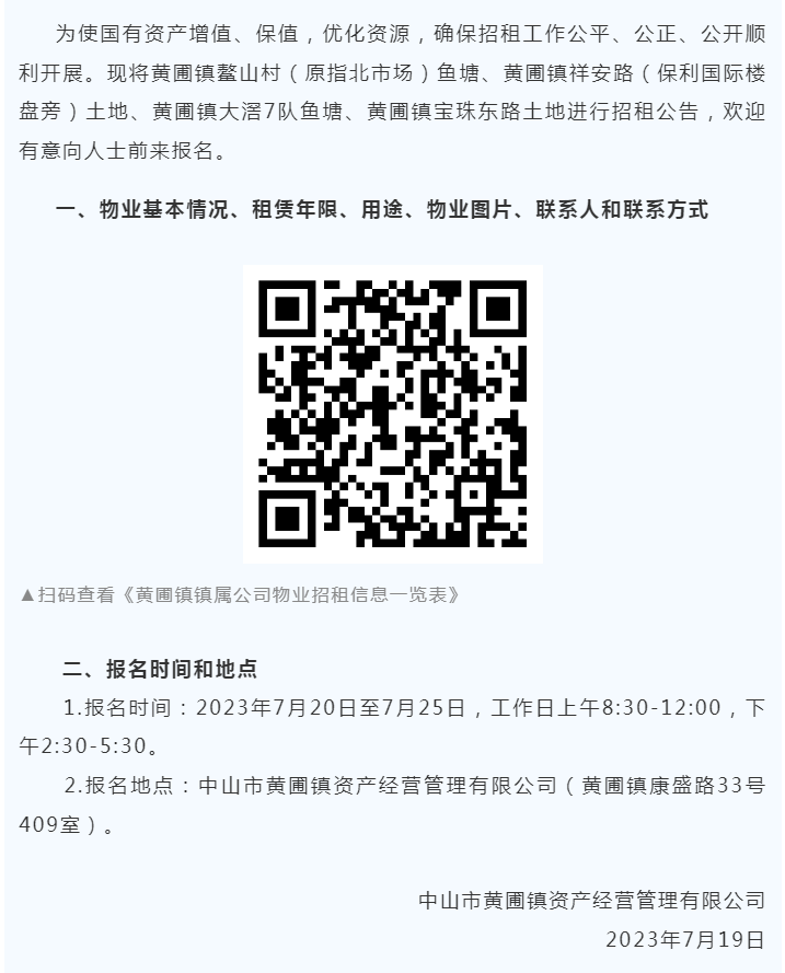 黄圃镇镇属公司物业招租公告