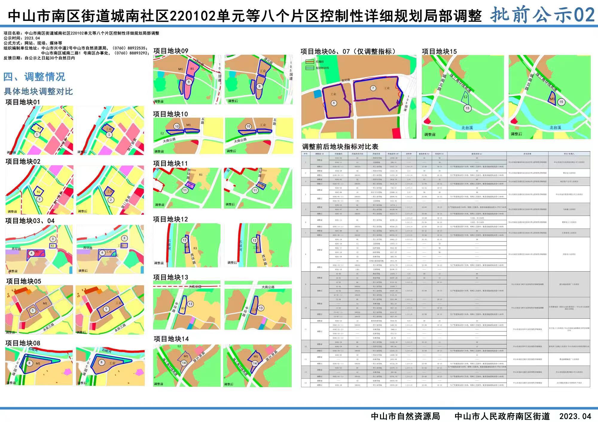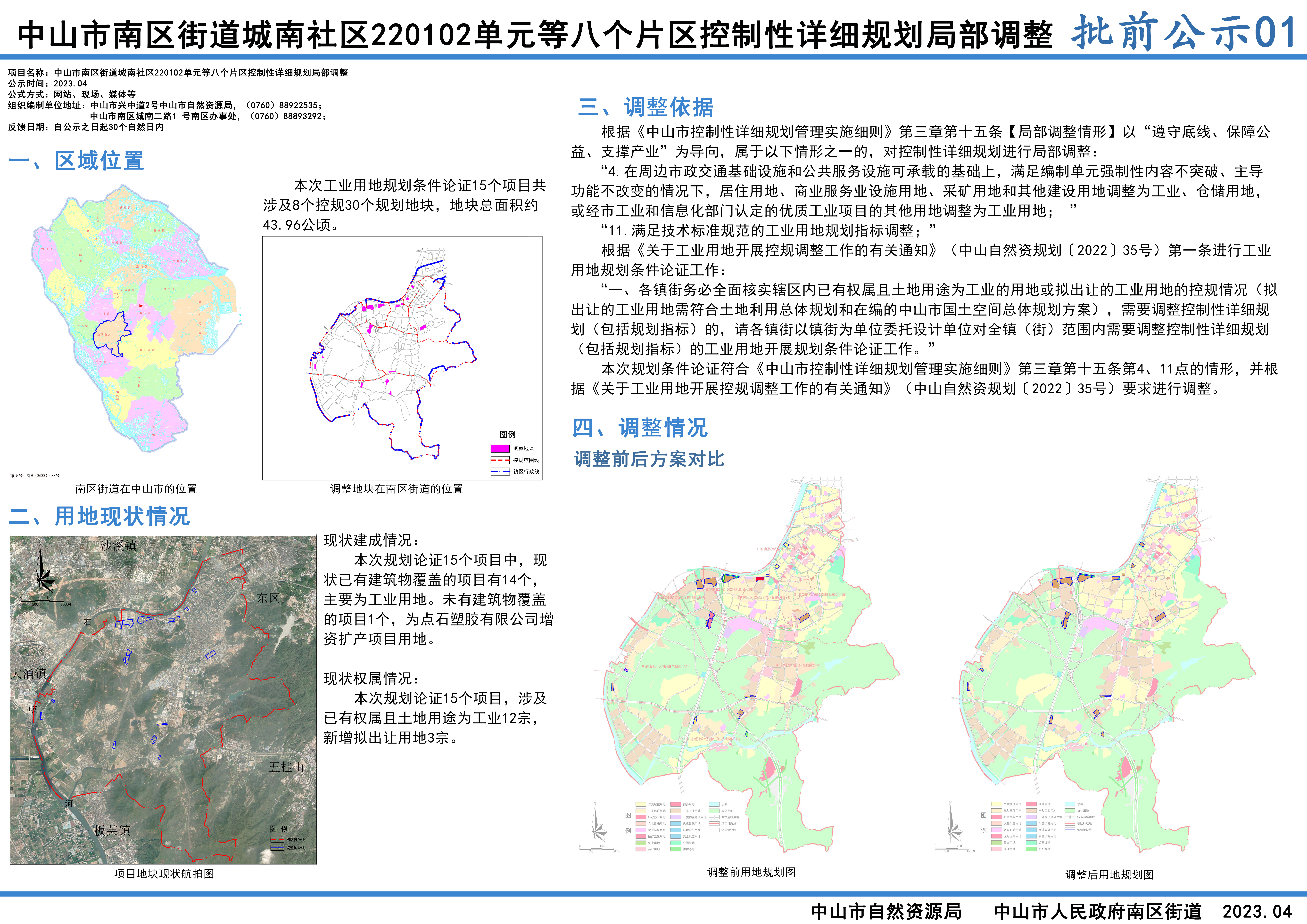 《中山市南区街道城南社区220102单元等八个片区控制性详细规划局部调整》草案已编制完成。根据《中华人民共和国城乡规划法》等法律法规要求,现对该草案予以公示。本次调整范围涉及15个项目地块,规划调整面积约43.96公顷。