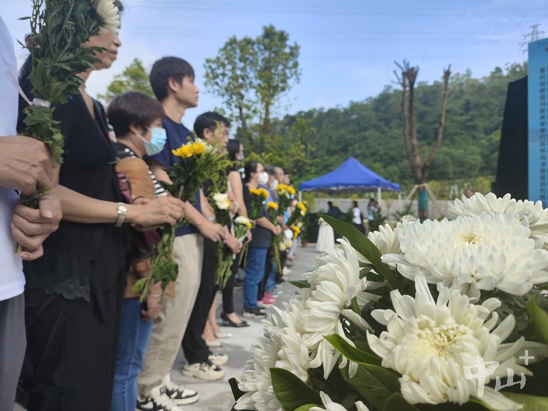 市福荫园公墓苍松翠柏、芳草茵茵。当日上午10时,一场肃穆庄重的送别仪式在中山市福荫园公墓骨灰楼广场举行。亲属将准备撒海的先人骨灰从骨灰楼取出。随后礼仪人员敬献花环,司仪诵读祭文。逝者亲属手捧鲜花安静肃立,在工作人员的指引下向亲人的骨灰鞠躬行礼、祭献鲜花,伴随着哀乐向逝去的亲人默哀,作最后告别。仪式结束后,由工作人员将逝者骨灰运送到指定海域代撒。