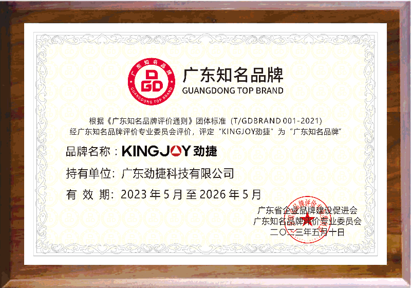 在2023广东品牌发展大会中,我镇广东劲捷科技有限公司持有品牌“KINGJOY劲捷”凭借自身在研发技术实力、创新能力、产业规模等综合优势,在众多广东品牌中脱颖而出,被评定为2023年第五批“广东知名品牌”。