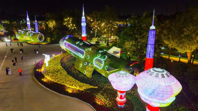 刚到入口,“花影星舰”便带着未来感撞入眼帘:被灯光点亮的“飞船”仿佛正要启航,搭配可互动的声光效果,让人仿佛踏入了科幻与花境交织的“未来之城”,身旁的“星球”灯组点点闪烁,更添满满科技质感。