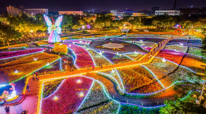 往花海区走去,七彩蝴蝶女神立于花海,遍布花海的灯光蝴蝶随着光影“振翅”,把大片盛放的各式鲜花映照得像打翻了调色盘,粉紫、明黄、雪白的花浪里,流动的彩灯又为这份浪漫添了几分灵动。