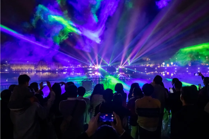 中心湖的灯光秀是每晚的重头戏:湖水映着岸边的“潮起湾区 花香菊城”主题灯饰,五彩灯光在水面碎成千万片星点,随着音乐缓缓变幻,把整个湖畔变成了流动的梦境。
