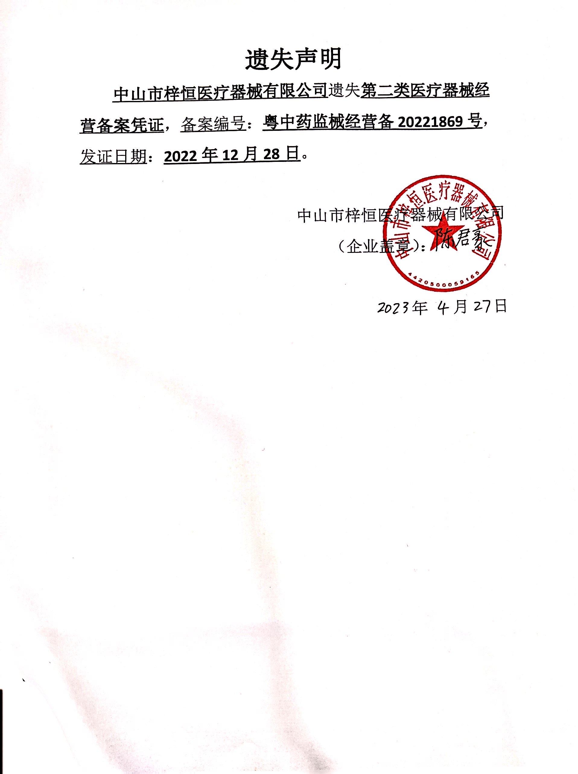 第二类医疗器械经营备案凭证遗失声明(中山市梓恒医疗器械有限公司)