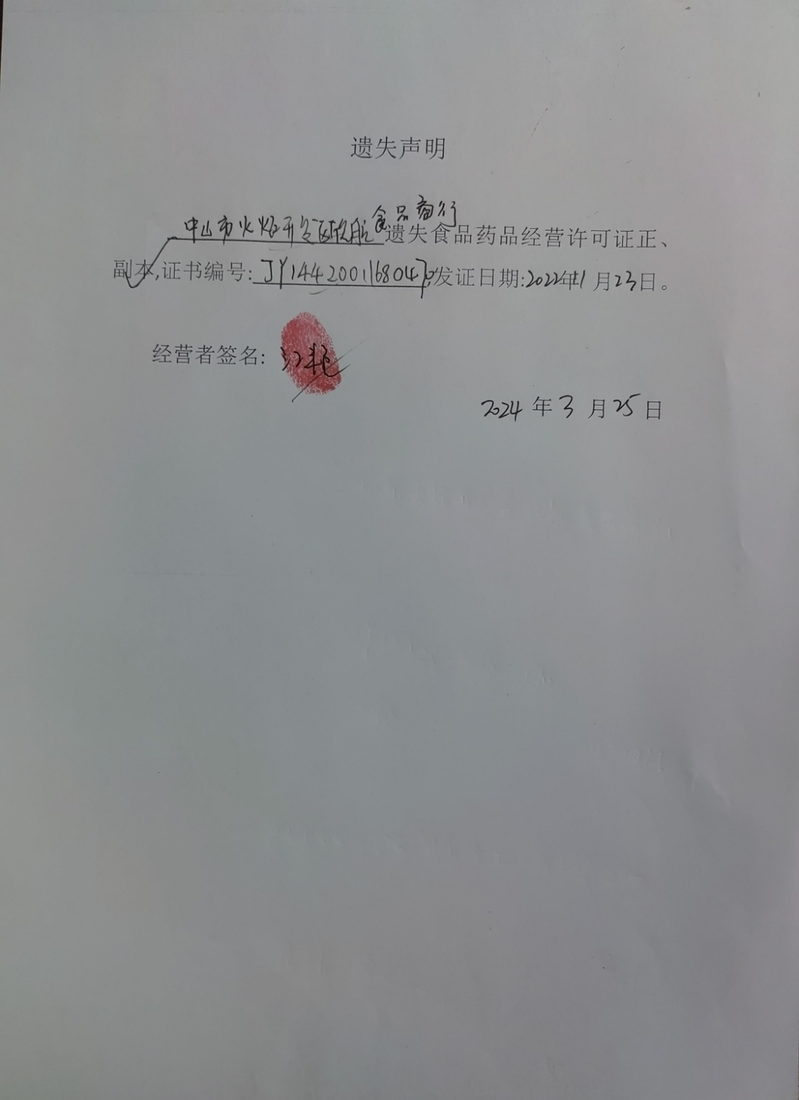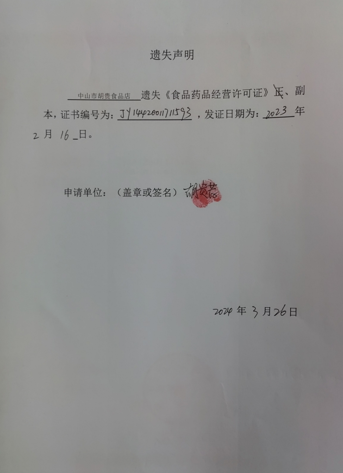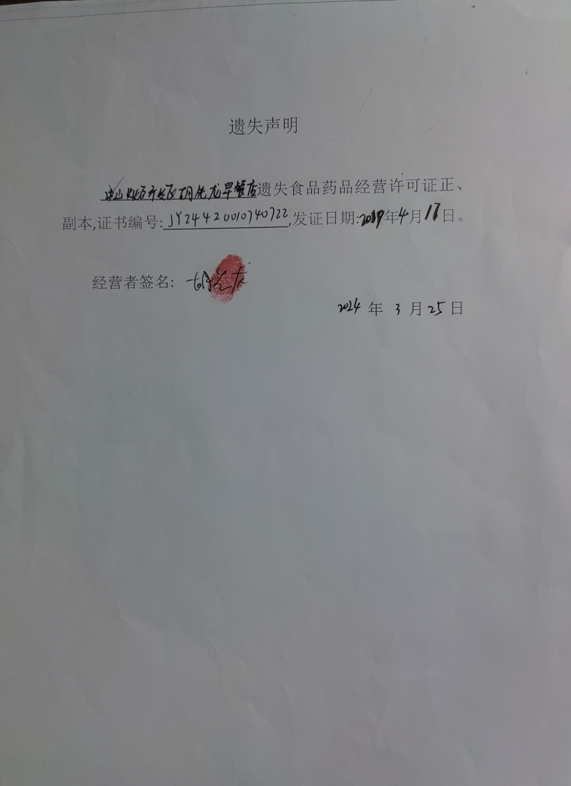 食品药品经营许可证遗失声明(中山火炬开发区胡先龙早餐店、中山市胡贵食品店、中山火炬开发区欣航食品商行)
