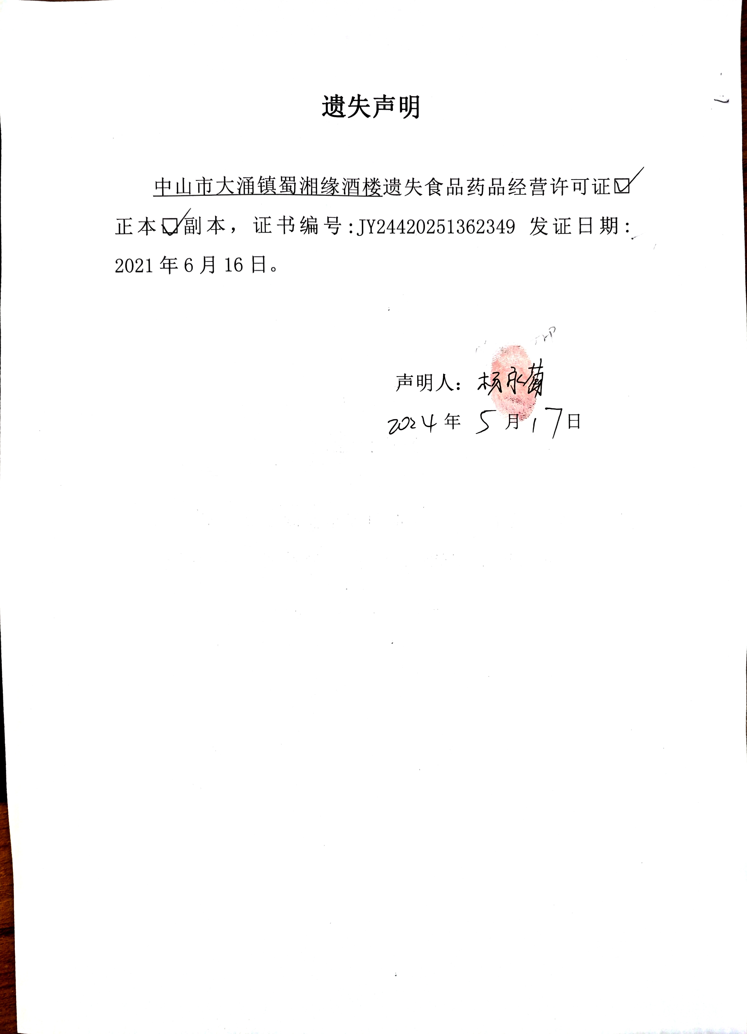 食品药品经营许可证遗失声明(中山市大涌镇蜀湘缘酒楼)