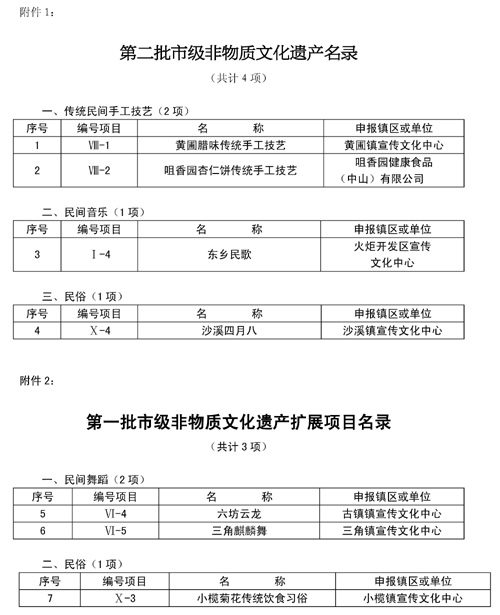 中山市人民政府批准市文化广电新闻出版局确定的第二批市级非物质文化遗产名录(共计4项)和第一批市级非物质文化遗产扩展项目名录(共计3项),现予公布。