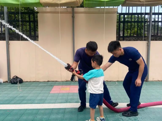 五桂山街道专职消防队队员肯定了师生应急反应的规范性,提出了优化建议,并对全园师生开展了消防安全培训。消防队员通过生动形象的讲解,向幼儿普及火灾逃生常识;小班幼儿近距离参观消防车,探索装备奥秘;近三年入职教职工参加灭火器实操培训,掌握“一提二拔三握四压”的操作要领;孩子们现场观看消防车高空射水,直观感受消防队的力量。