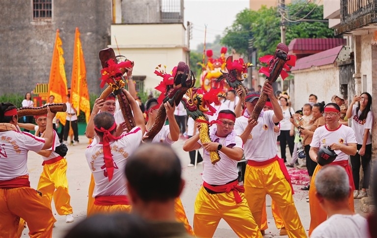 In many villages (communities) across Zhongshan, such as Changzhou, Zhangxi, Haotou and Qiwan, there are traditional customs of holding dragon and lion dance parades around lunar April 8 (which falls on May 15 this year) every year to pray for good weather and bumper harvests. On May 12, Haotou Village in Torch Development Zone and Zhangxi Village in Shiqi District held the parades in advance.