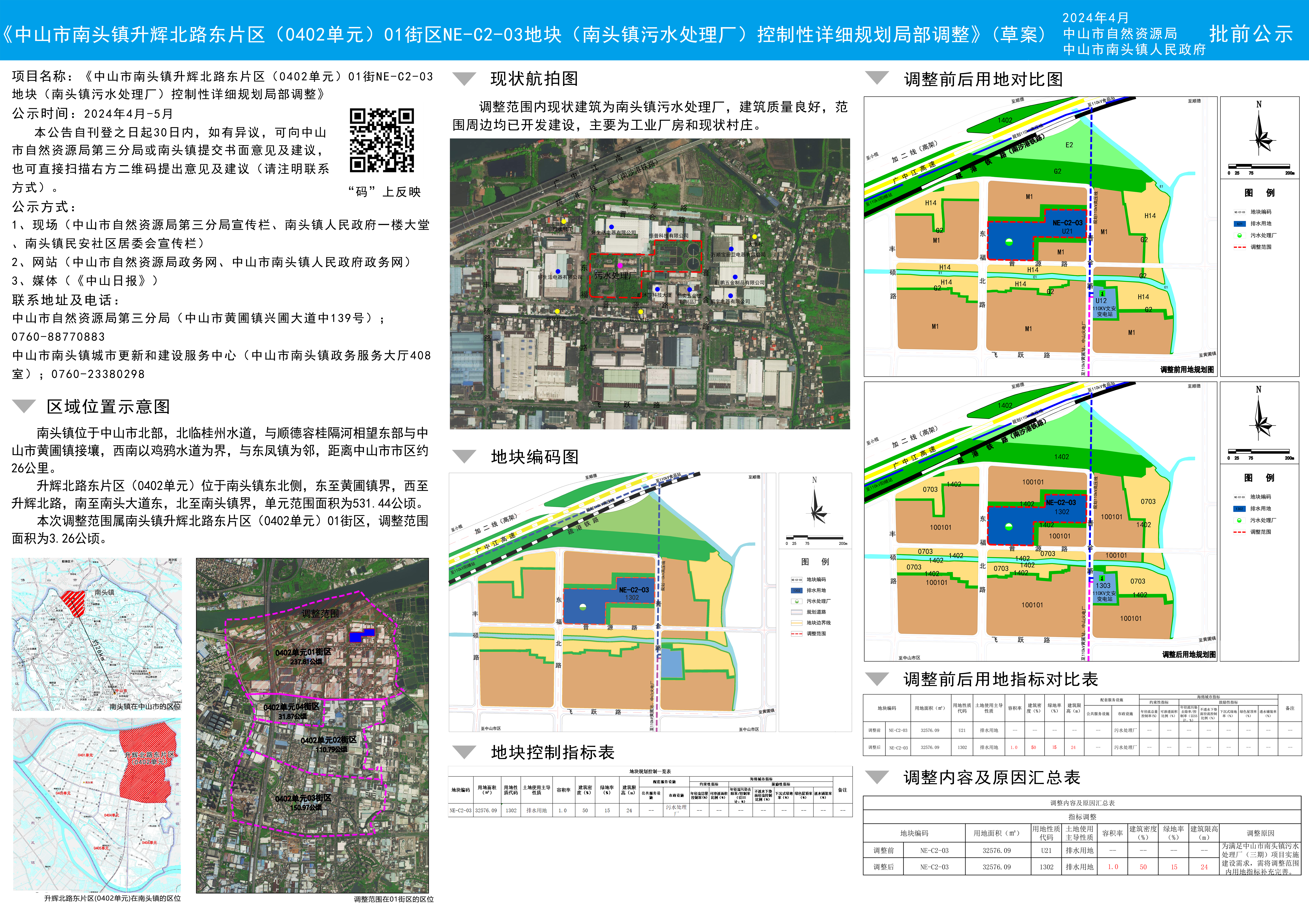 《中山市南头镇升辉北路东片区(0402单元)01街区NE-C2-03地块(南头镇污水处理厂)控制性详细规划局部调整》草案已编制完成。根据《中华人民共和国城乡规划法》等相关法律、法规要求,现对该草案予以公示。