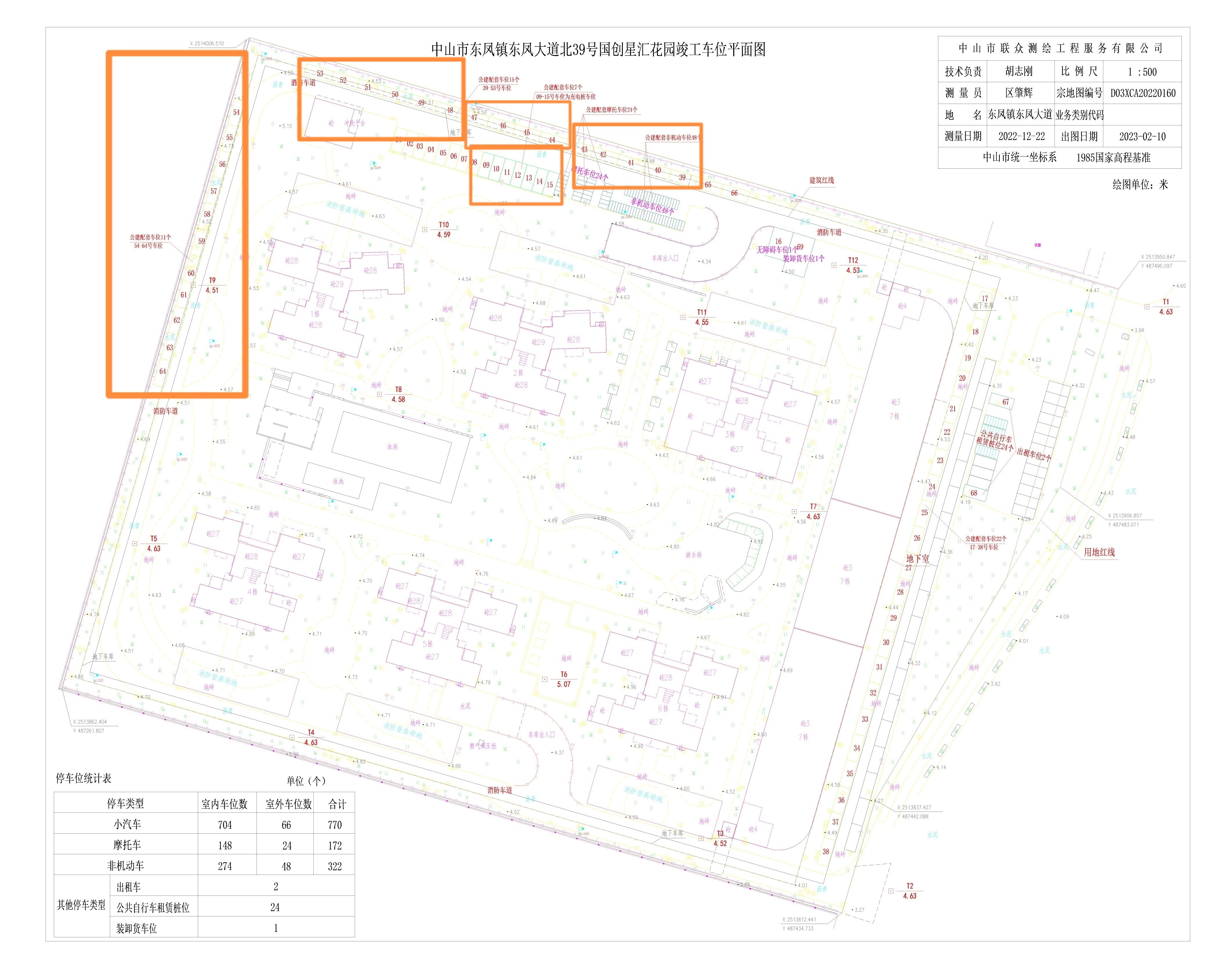 2、小车位:40个。其中地下产权车位7个(001号-005号、597号、636号)。非产权地上车位:33个。09号-15号充电桩车位,39号-64号小车位