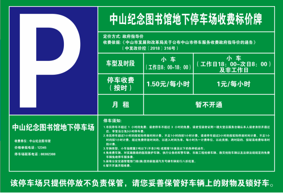 为缓解中山纪念图书馆停车难问题,提高停车场管理水平,向市民提供更规范、便捷的停车环境,中山纪念图书馆停车场于2024年9月11日零时起正式实施收费管理。收费标准将严格按照《中山市发展和改革局关于公布中山市停车服务收费政府指导价的通告》(中发改价控〔2018〕316号)执行,具体收费标准详见停车场出入口收费公示牌。