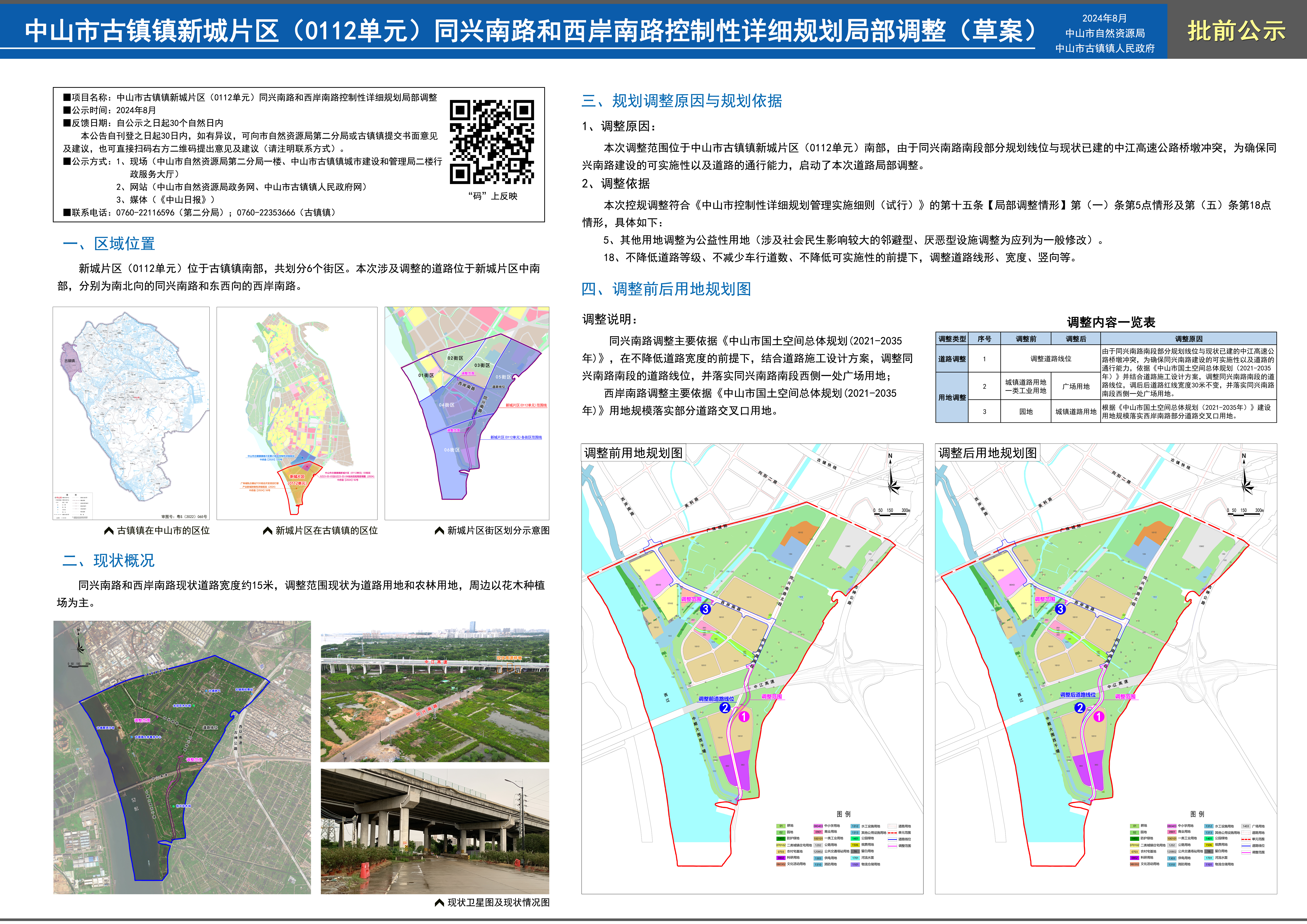 《中山市古镇镇新城片区(0112)单元同兴南路和西岸南路控制性详细规划局部调整》草案已完成编制。根据《中华人民共和国城乡规划法》及相关法规,现将上述草案予以公示。