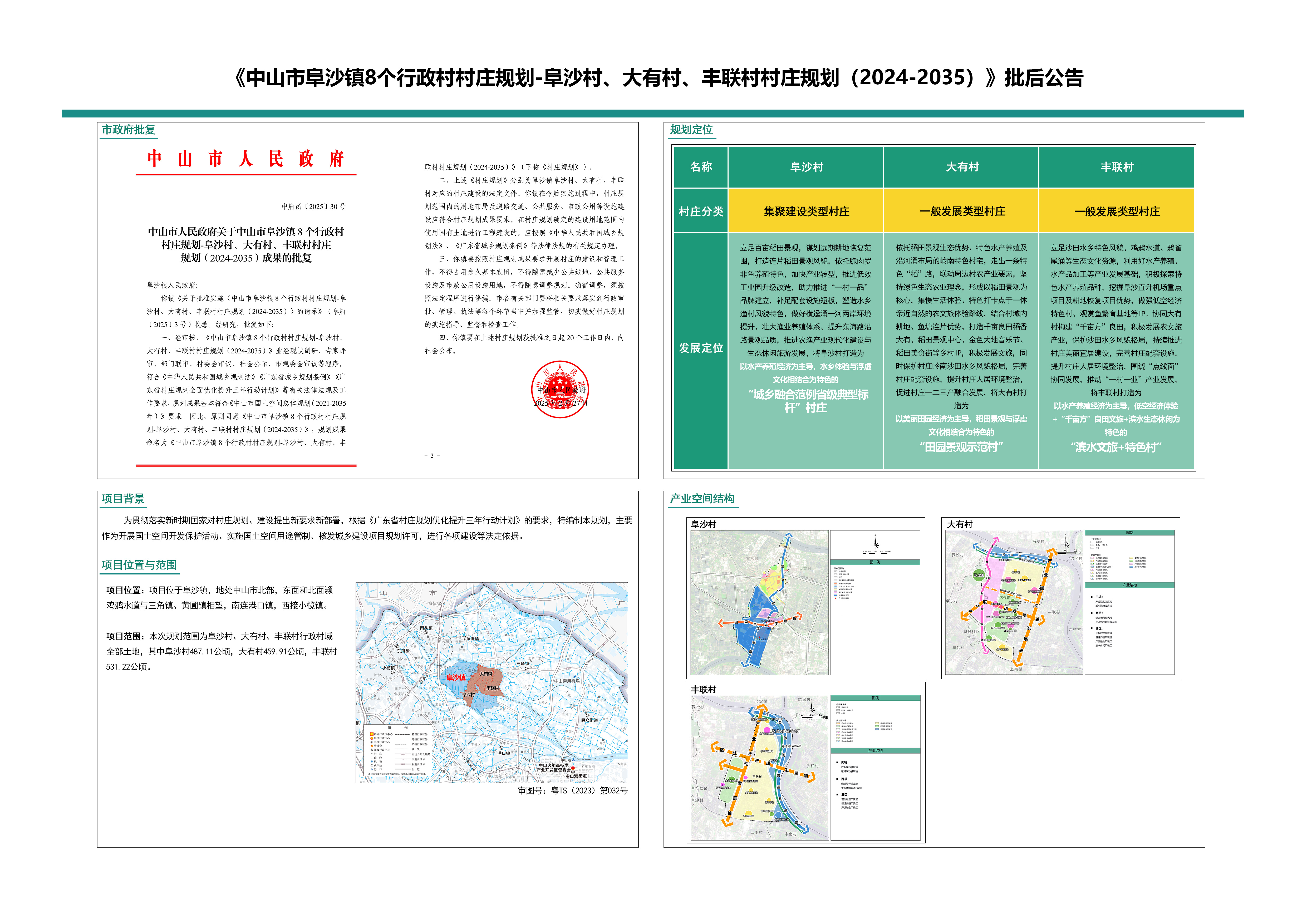 《中山市阜沙镇8个行政村村庄规划——阜沙村、大有村、丰联村村庄规划(2024-2035)》经中山市人民政府批复。根据《中华人民共和国城乡规划法》《广东省城乡规划条例》等相关法律、法规要求予以批后公布。有关规划成果信息可在市自然资源局网站(http://www.zs.gov.cn/zrzyj)和阜沙镇人民政府网站(http://www.zs.gov.cn/fsz)查询。