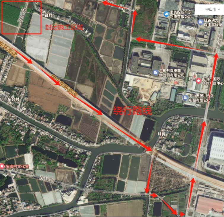 二、封闭路段:对东南村防汛路部分路段实施临时封闭两车道施工,在该路段前、后将设置车辆绕道提示牌、施工牌、反光标识等。