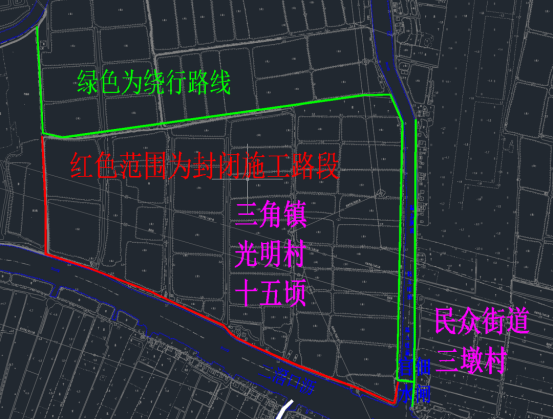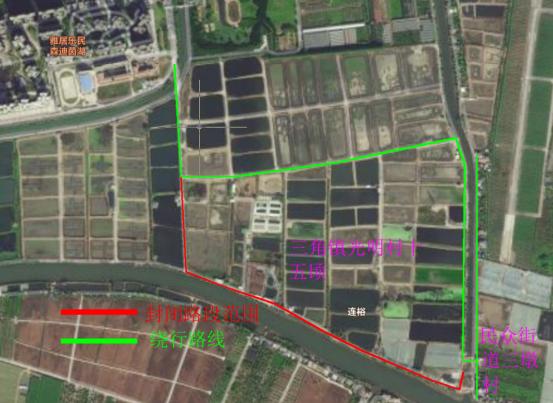 1、封闭道路:该路段连接三角镇光明村十五顷以及民众街道三墩村新村上街,具体封闭道路及范围见附件1示意图。