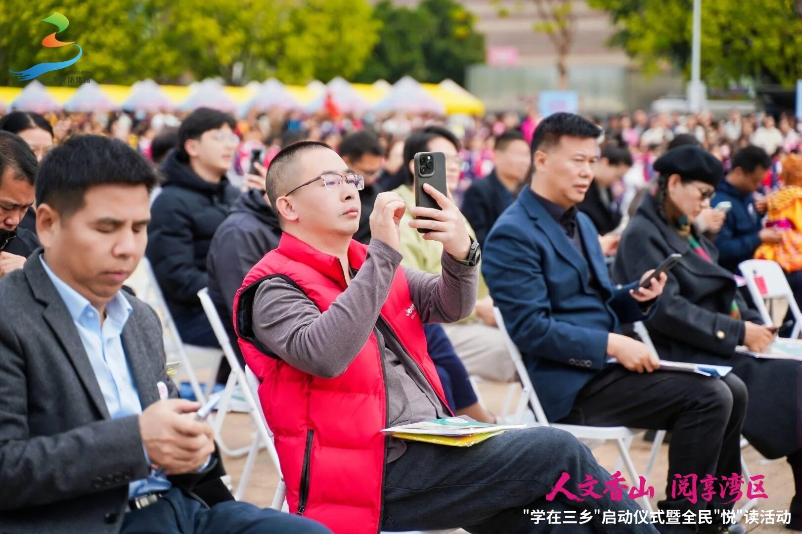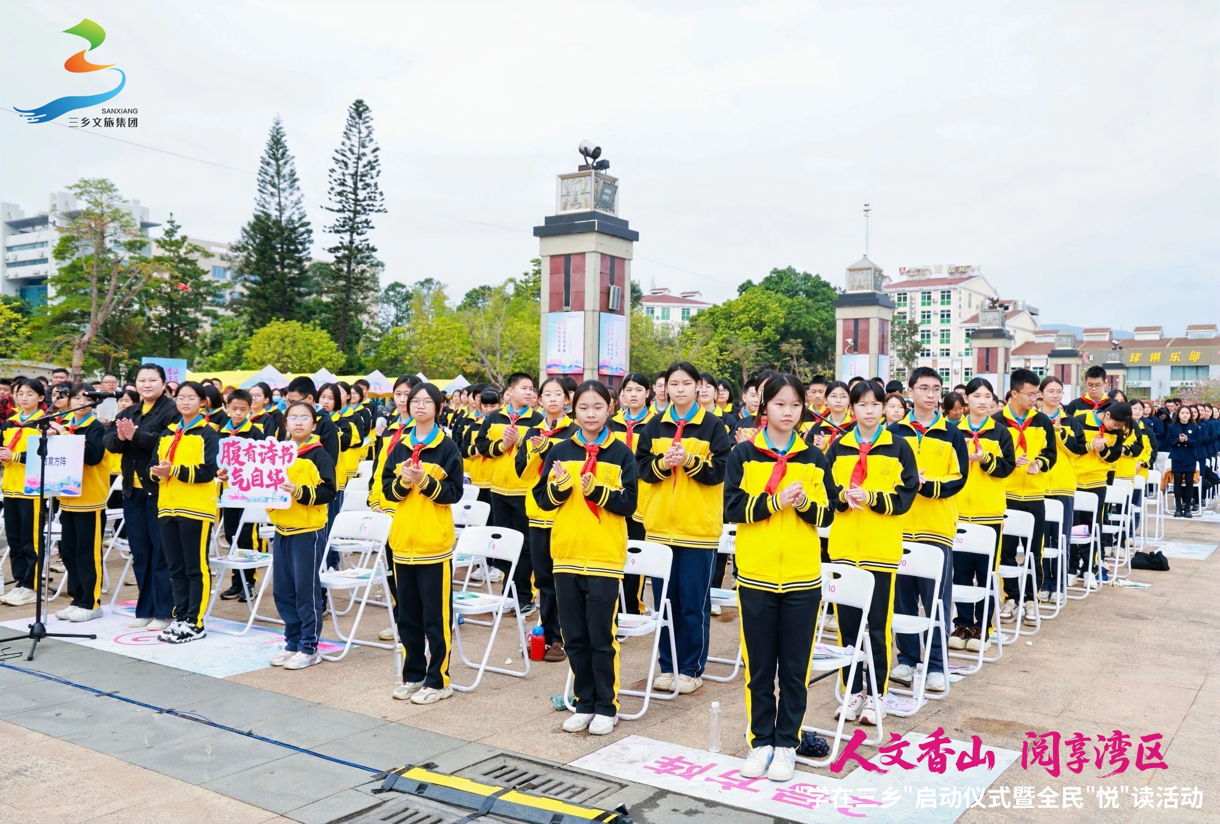 现场,来自三乡教育方阵、共青团员、三乡校本课程研发、中山阅读之星、中山市三鑫学校教师、港澳同胞、妇女、企业、工会以及社会各界代表等十一个线下千人方阵,与线上连线的广东欧铠科技有限公司、郑观应故居、鸦岗小学,以及中山三乡镇(香港)同乡会、澳门中山三乡同乡会、香港太极总会等港澳社团代表和参与全镇中小学寒假第一课的学生们,共同构成了跨越地域与群体的万人共读方阵,展现了全民阅读的广度与深度。