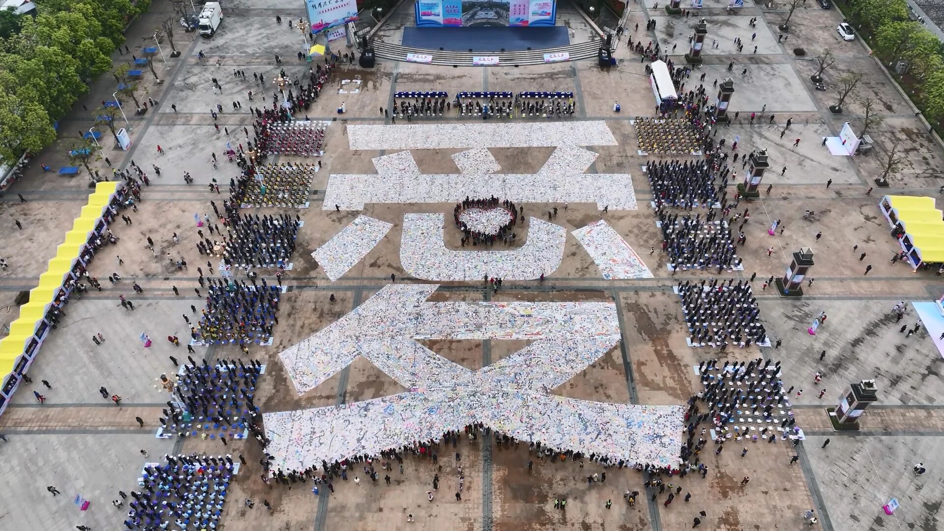 当最后一本书归位,一个面积达3333m²的巨型“爱”字在广场中央完整呈现。“3333m²”不仅是万卷书的汇聚,更是万颗爱心的交融,寓意着三乡生产、生活、生态“三生融合”的万千气象,更是全民共学、开卷有益的生动写照。